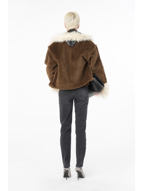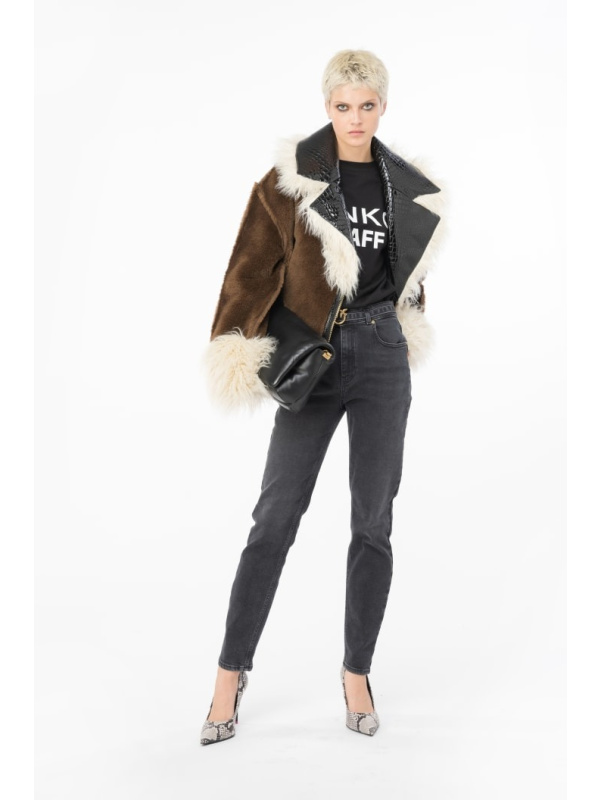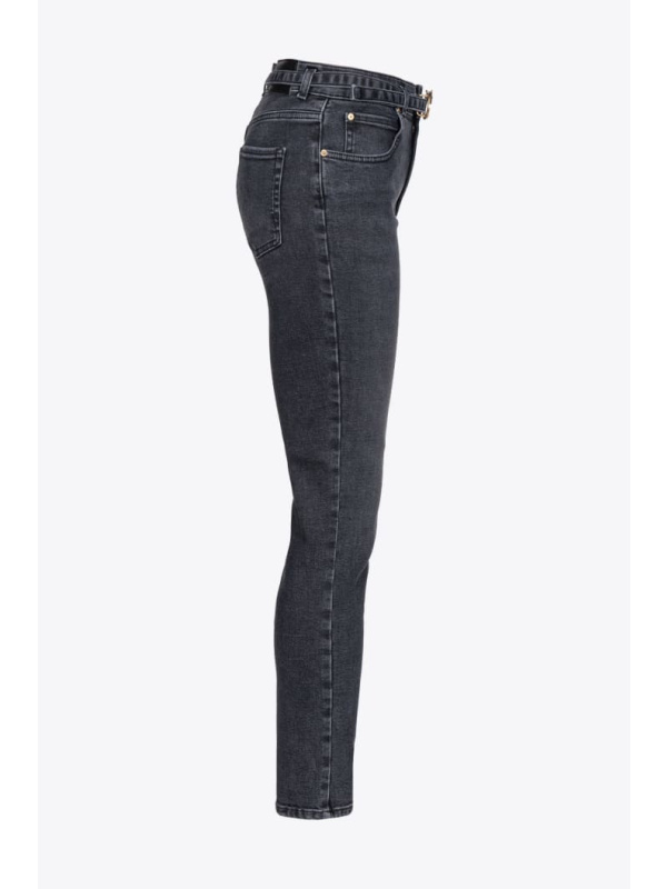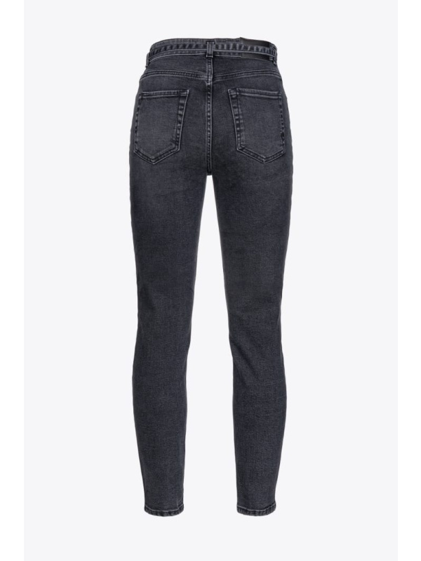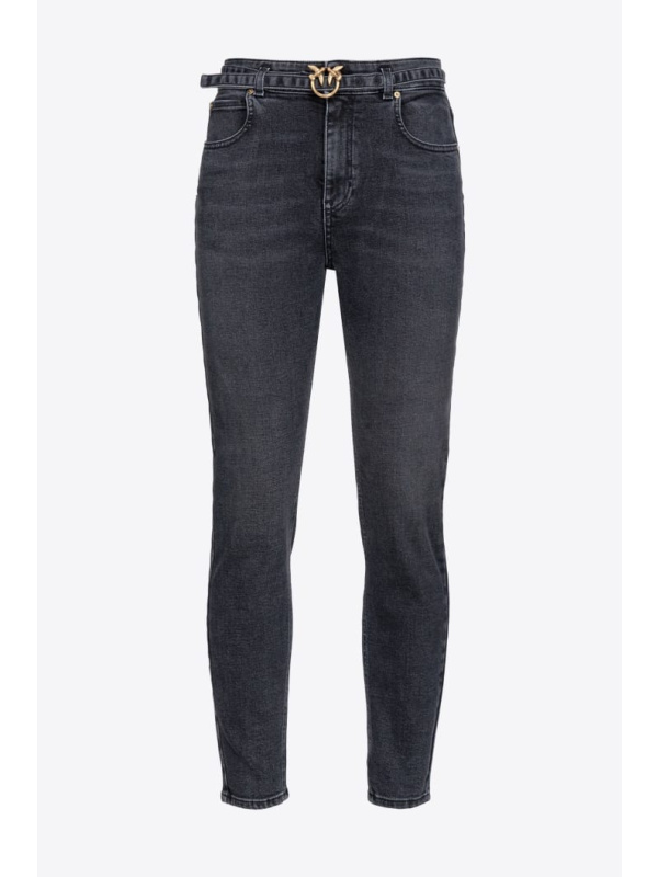 Uske traperice s pet džepova od kompaktnog crnog rastezljivog trapera. Visoki struk s petljama za remen i tankim odgovarajućim remenom od tkanine s mini metalnom Love Birds Diamond Cut kopčom. Uske nogavice i vez Love Birds na jednom od stražnjih džepova. Kopčanje metalnim patentnim zatvaračem i gumbom.