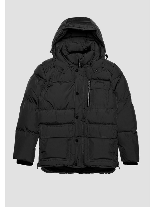 Ima kapuljaču koja se može podešavati pomoću praktične vezice, dva prednja džepa s preklopom i džep na strani srca s okomitim patentnim zatvaračem.