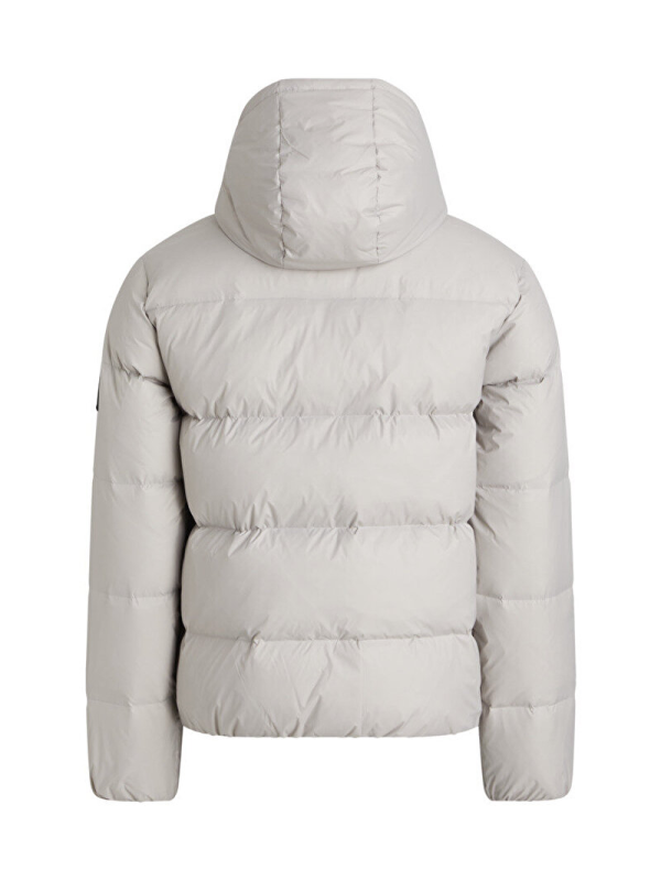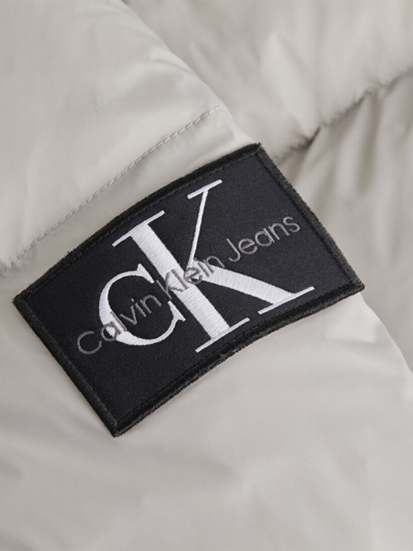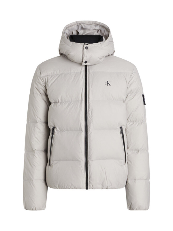 Obična muška perjanica, od svijetlo sivog najlona, s patentnim zatvaračem i logotipom Calvin Klein Jeans s monogramom sprijeda.