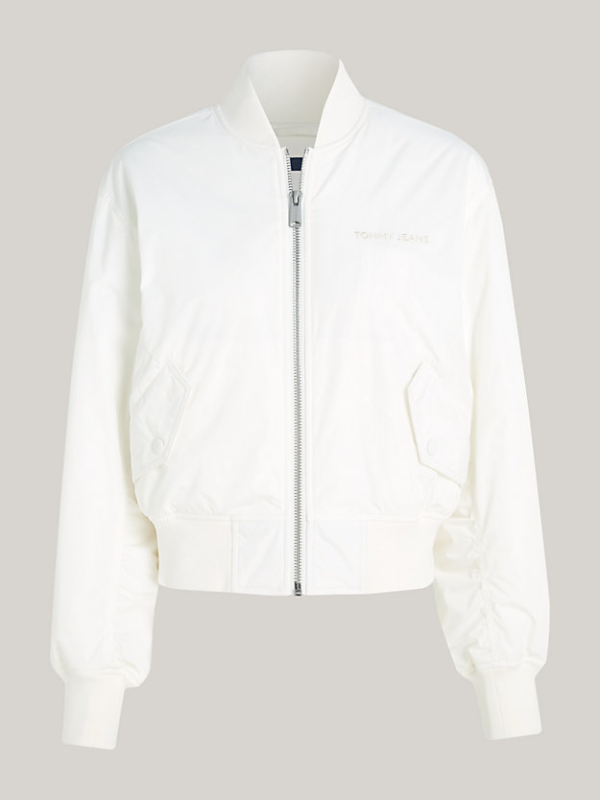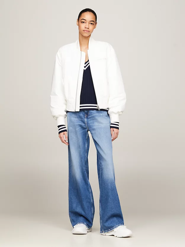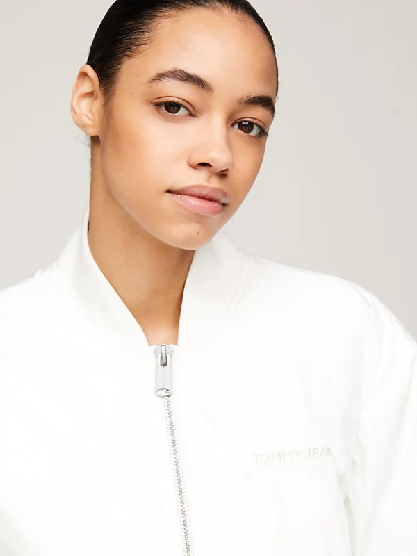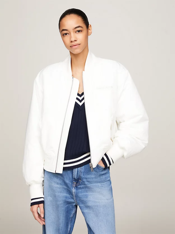 Zakopčajte ovu lagano podstavljenu Tommy Hilfiger bomber jaknu za udoban, ležeran dojam s blago spuštenim ramenima i visokim bejzbol ovratnikom.