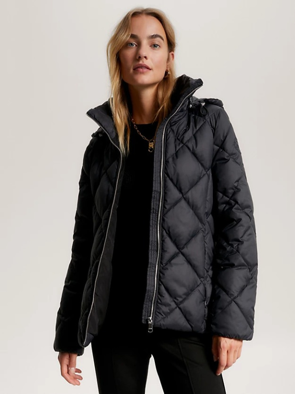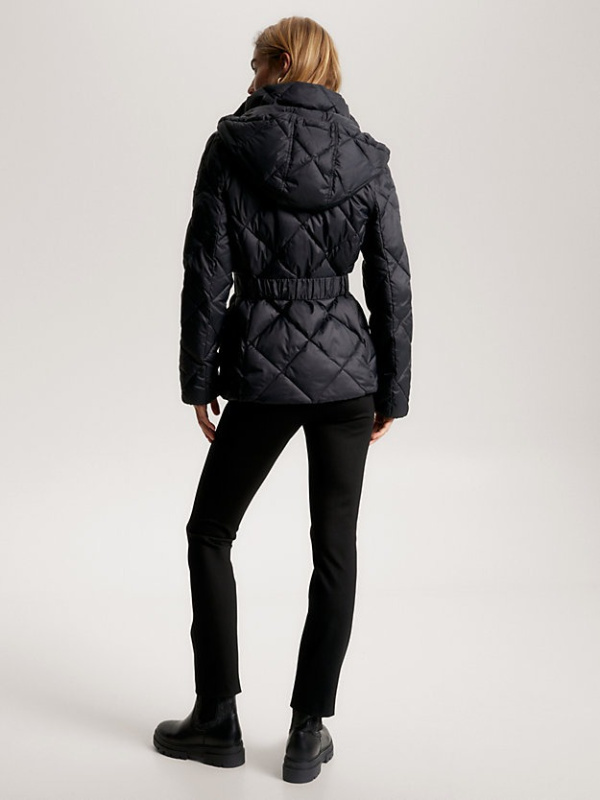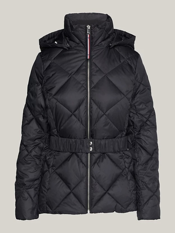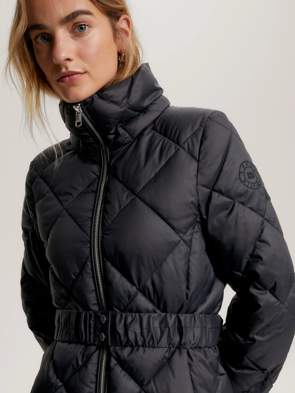 Ova prošivena jakna spaja modu s funkcionalnošću, ima okrugli vrat za toplinu i laskavi pojas u struku