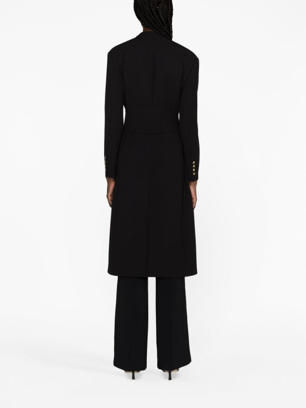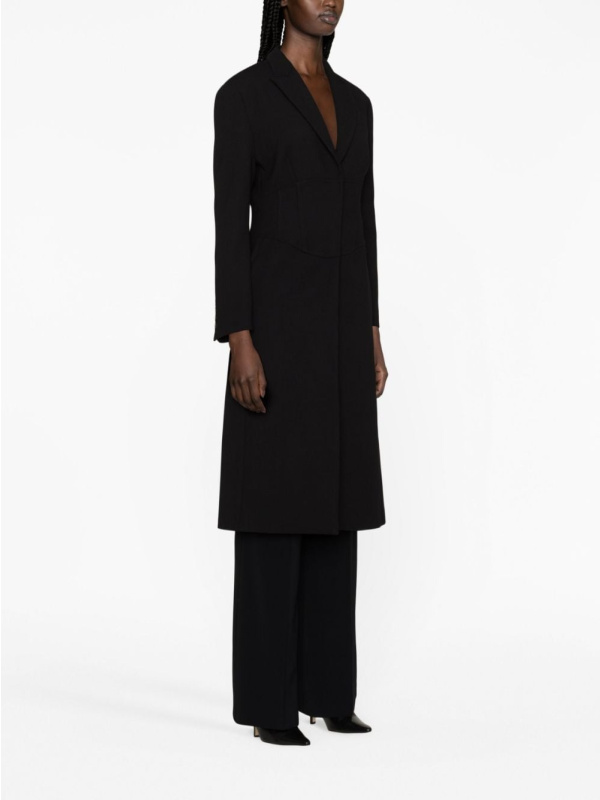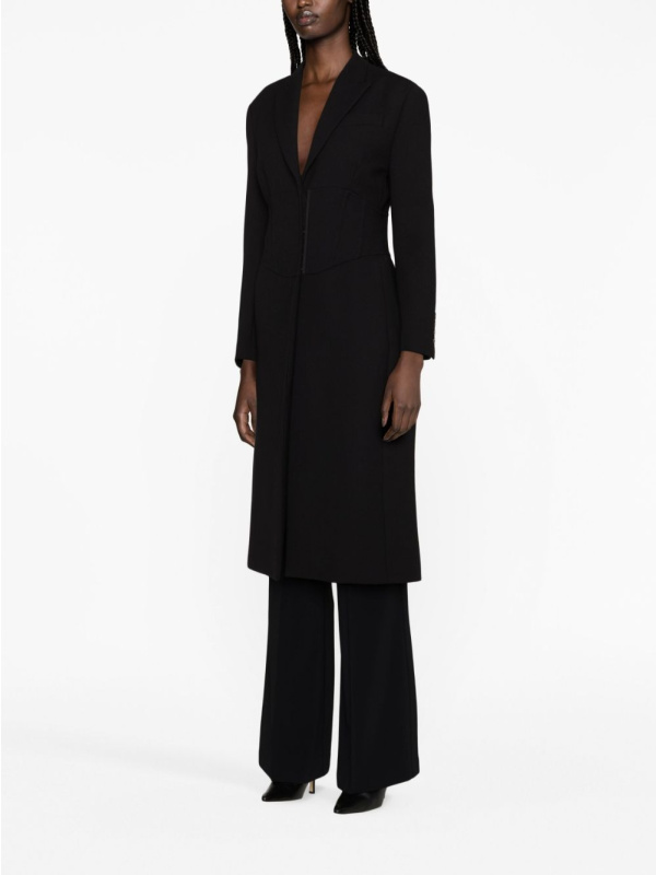 Izrađeno od mješavine crne vune, jednoredno kopčanje na skriveno kopčanje, zajedno s dubokim V-izrezom, dodaju primamljivu notu vanjskom komadu odjeće.