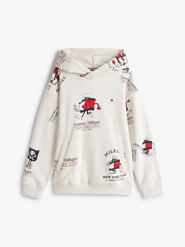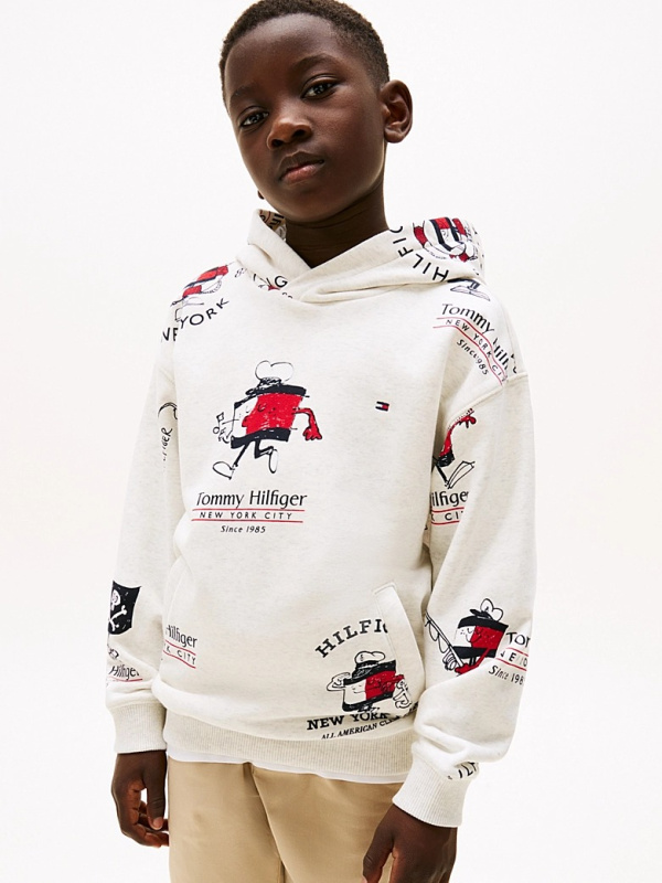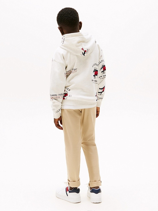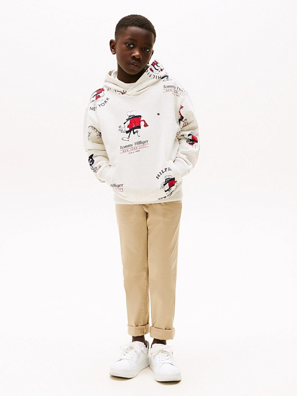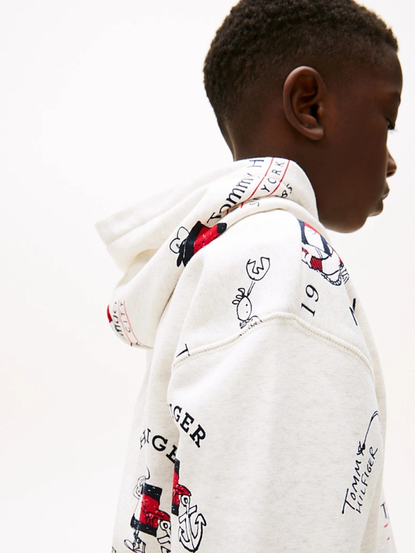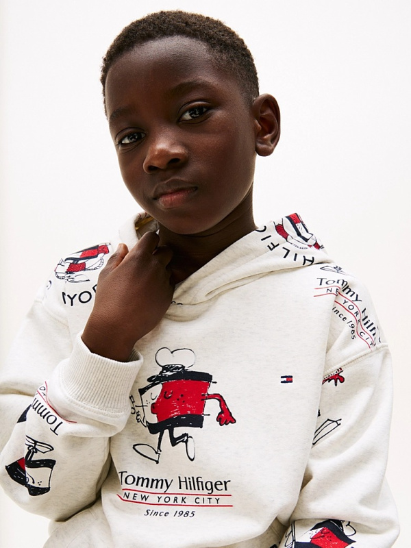 Bijela Tommy Hilfiger dukserica za dječake s kapuljačom, džepom i all-over printom