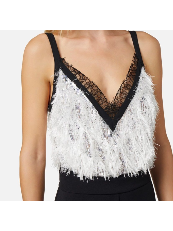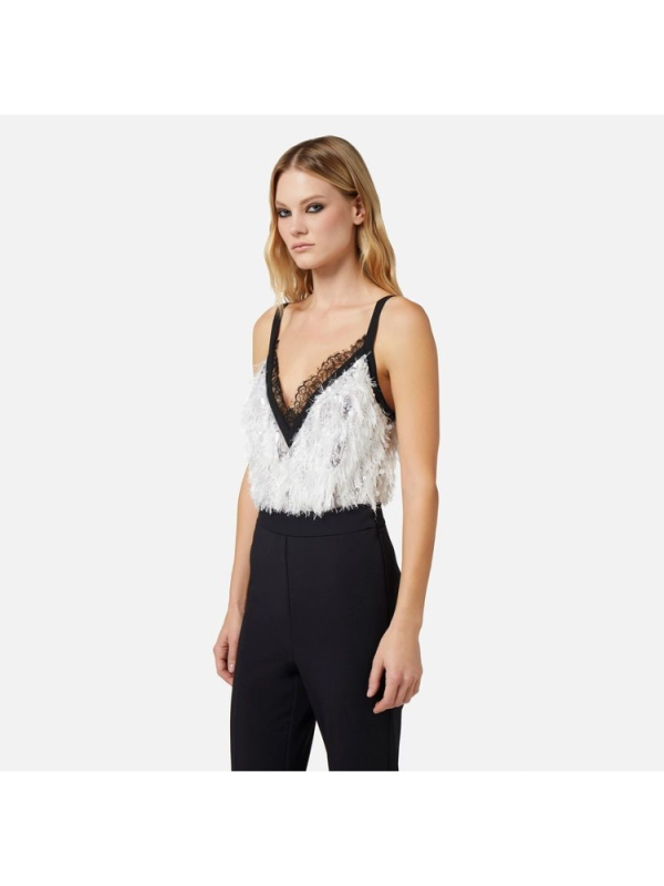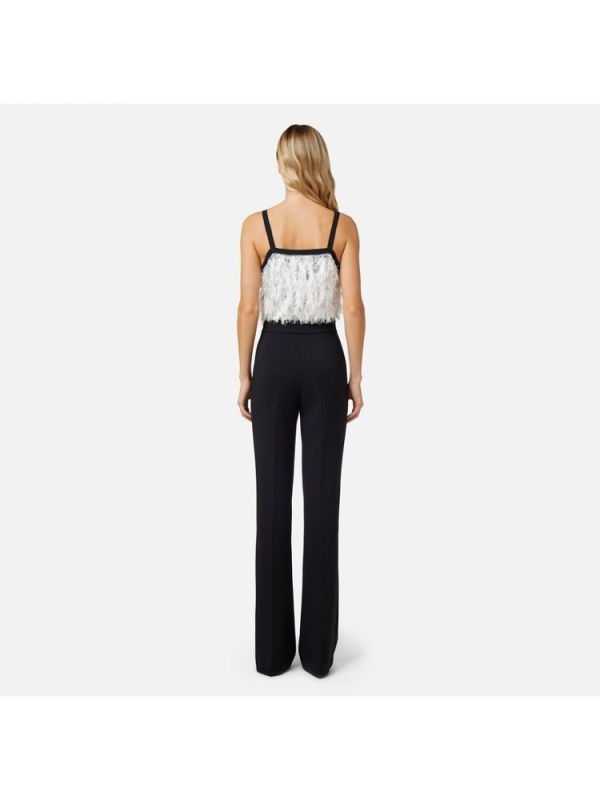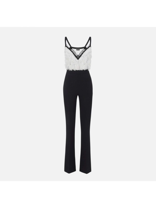 Ženski ELISABETTA FRANCHI krep kombinezon sastavljen od topa izvezenog šljokicama, čipkom i resama od organze i palazzo hlačama