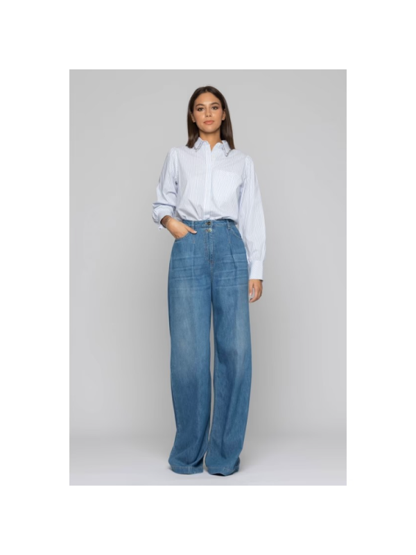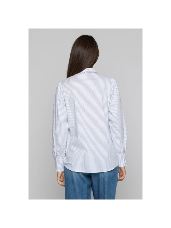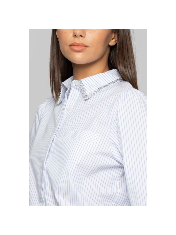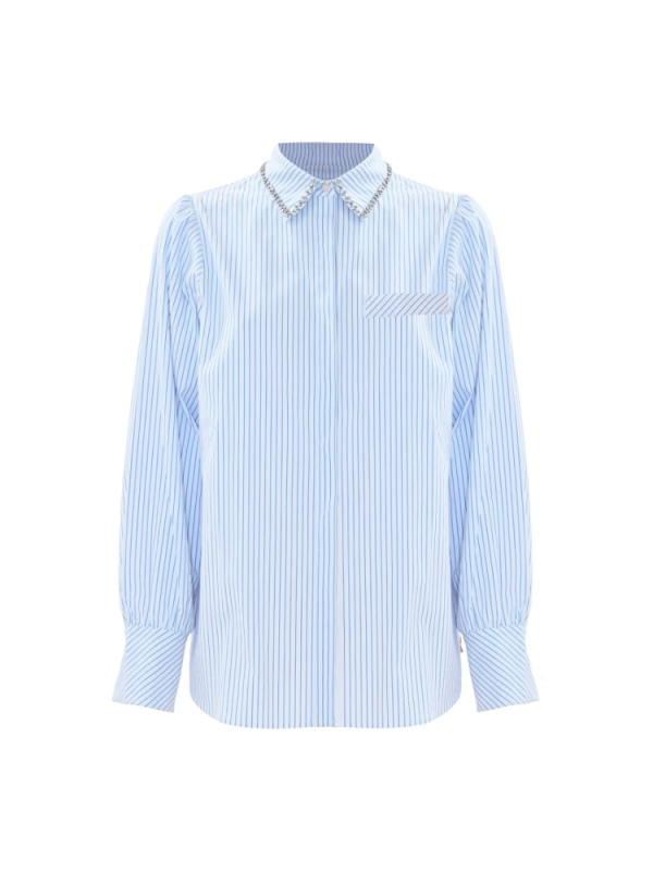 Košulja s uskim prugama, dugih rukava u suptilnom obliku balona i ovratnika s ušivenim slamnatim kamenčićima.