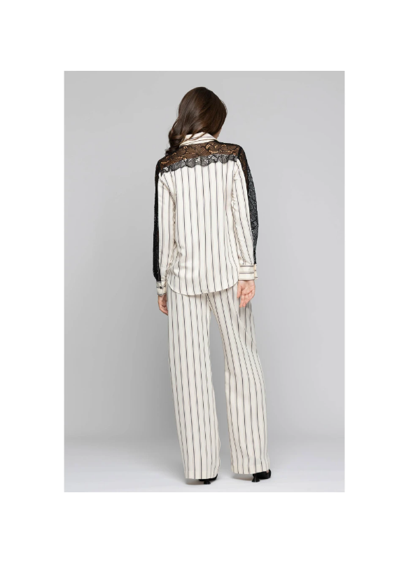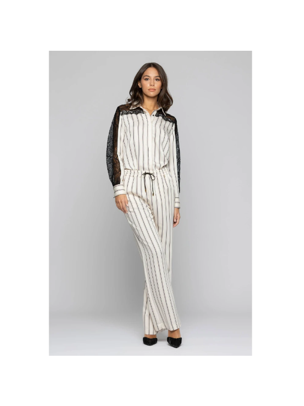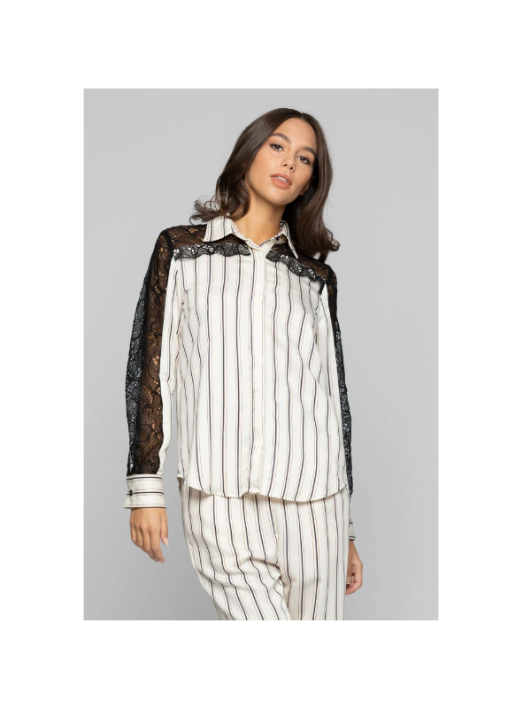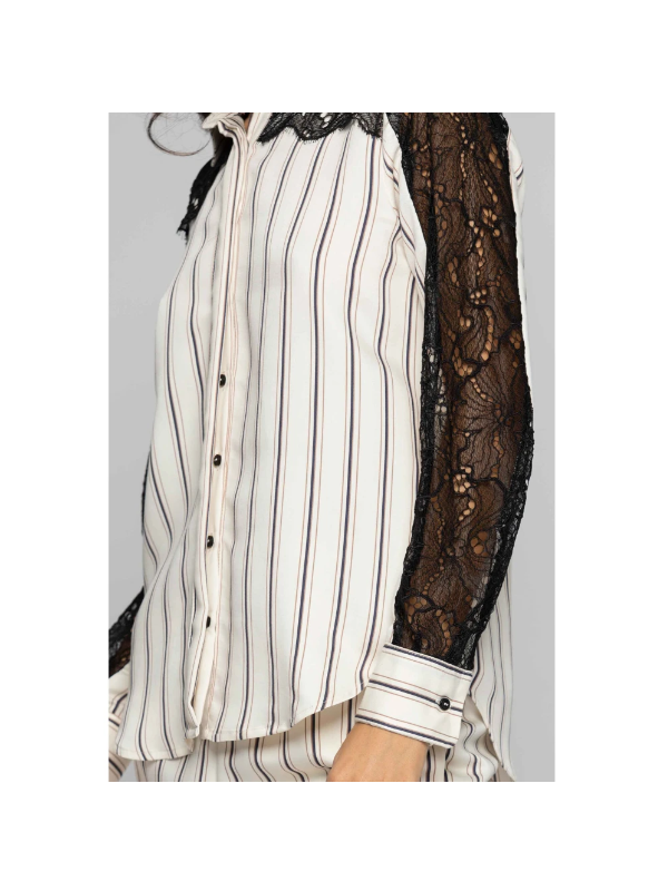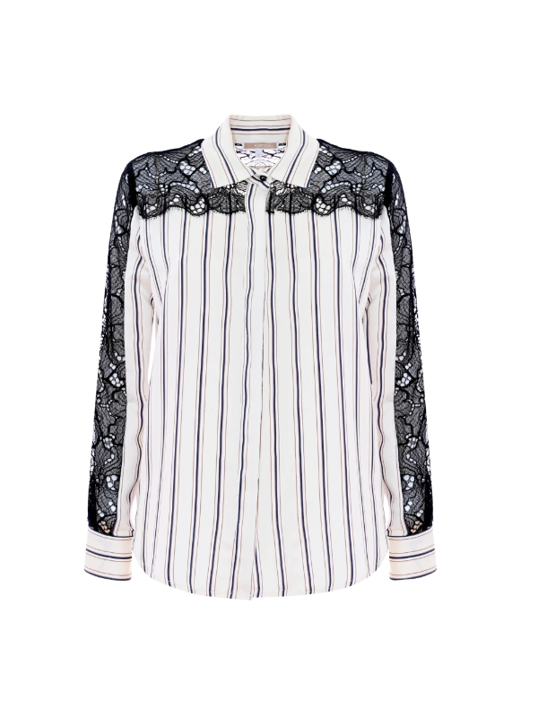 Prugasta viskozna KOCCA košulja s dugim rukavima i detaljima od crne čipke na ramenima i rukavima.