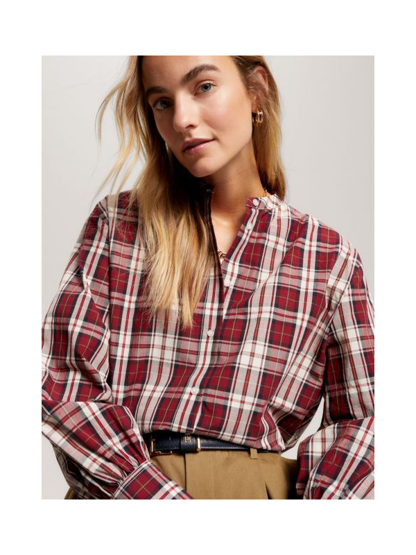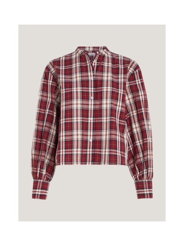 Ova skraćena košulja bez ovratnika skrojena je od rastezljivog pamuka s bezvremenskim tartan karom i ima elegantne rukave s manšetama.