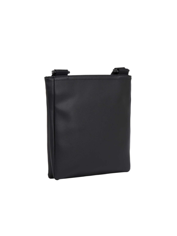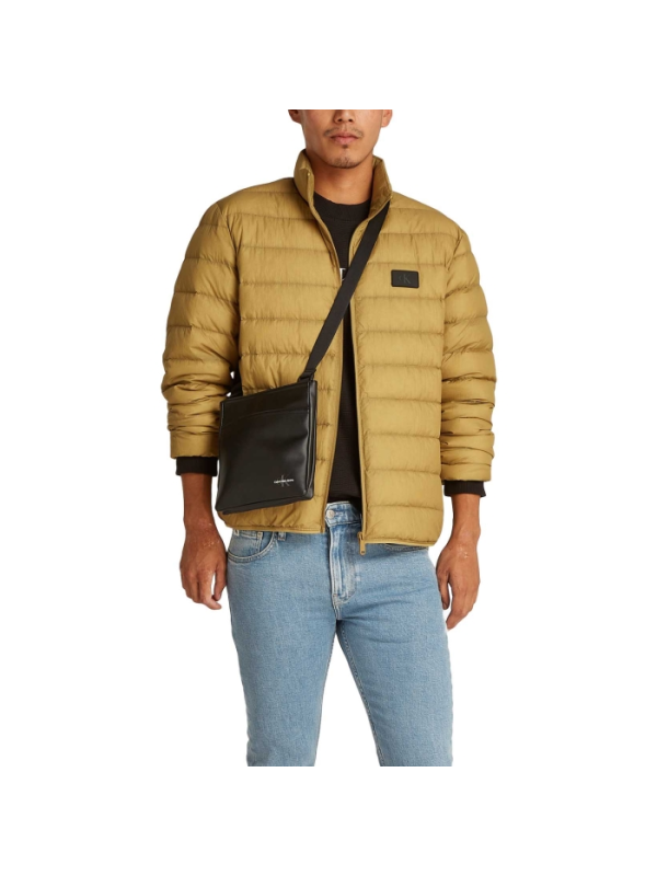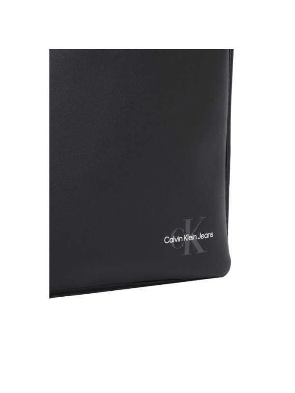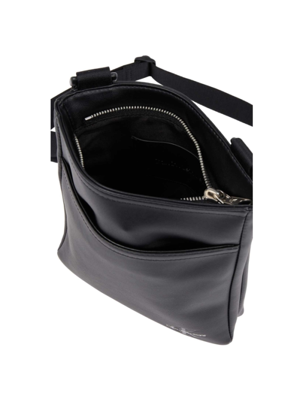 Muška torba za rame od crne umjetne kože s glatkom završnom obradom, kopčanjem na patentni zatvarač i logotipom Calvin Klein Jeans utisnutim na prednjoj strani.