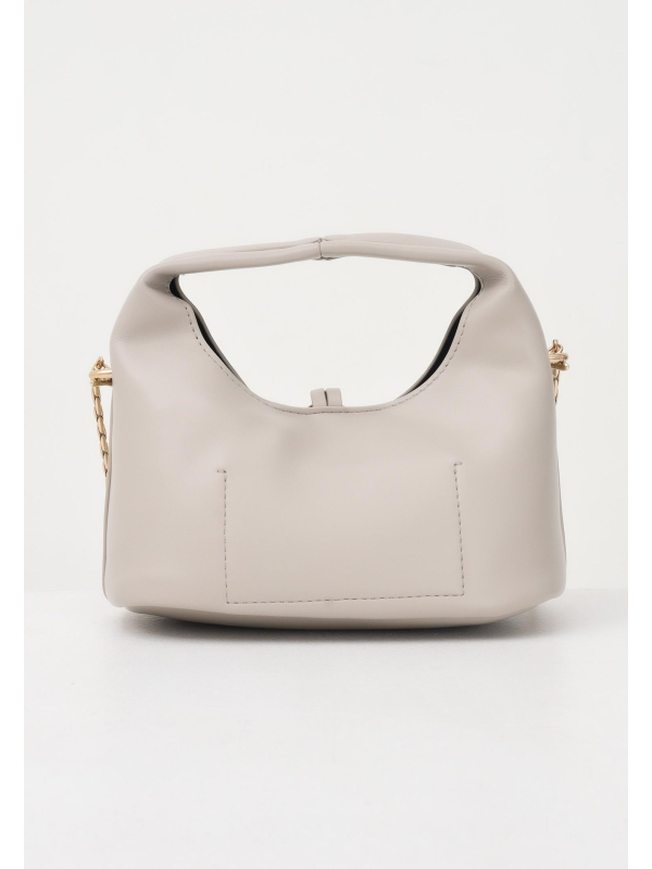 Izrađena od glatkog materijala s efektom kože, ističe se svojim mekim oblikom, elegantnim zlatnim metalnim detaljima i dvostrukom prenosivošću: u ruci ili preko tijela zahvaljujući tkanom remenu za rame od zlatnog lanca.