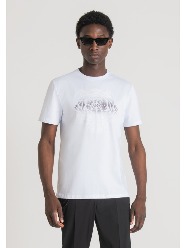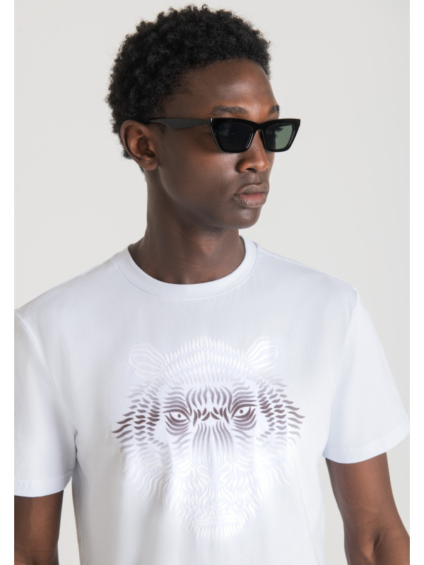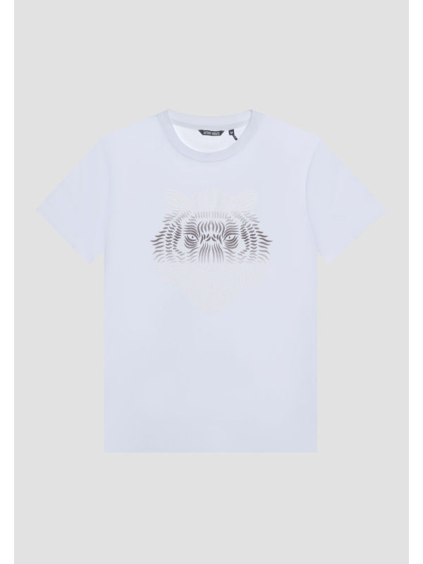 Majica kratkih rukava s okruglim izrezom od čistog pamuka. Prednji dio odjevnog predmeta oživljava kontrastni print tigra.