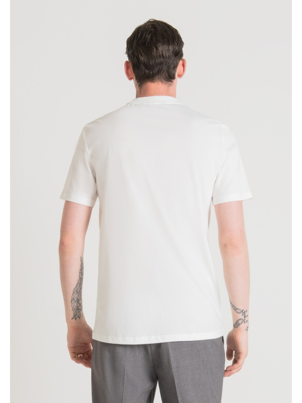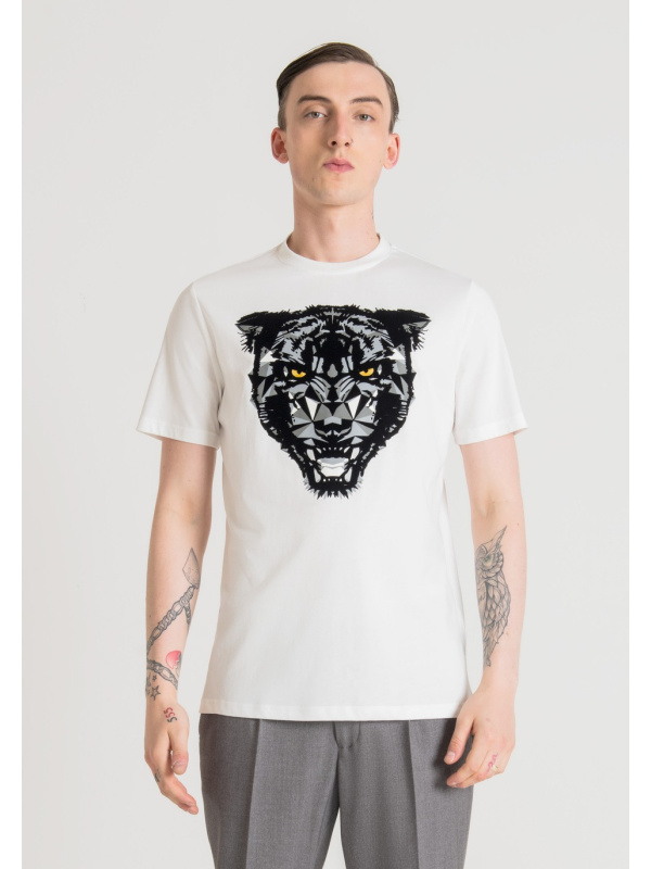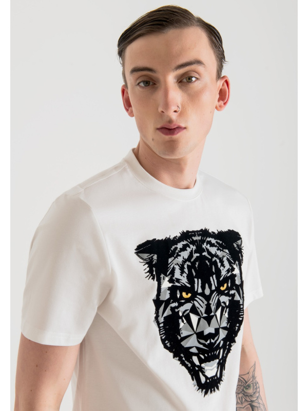Ova udobna majica kratkih rukava ima hrabar print pantere. Dizajnirana s okruglim izrezom i regularnim krojem, u potpunosti je izrađena od jednobojnog mekanog pamuka. Neophodan je za ulazak u dan s pravom dozom stava.