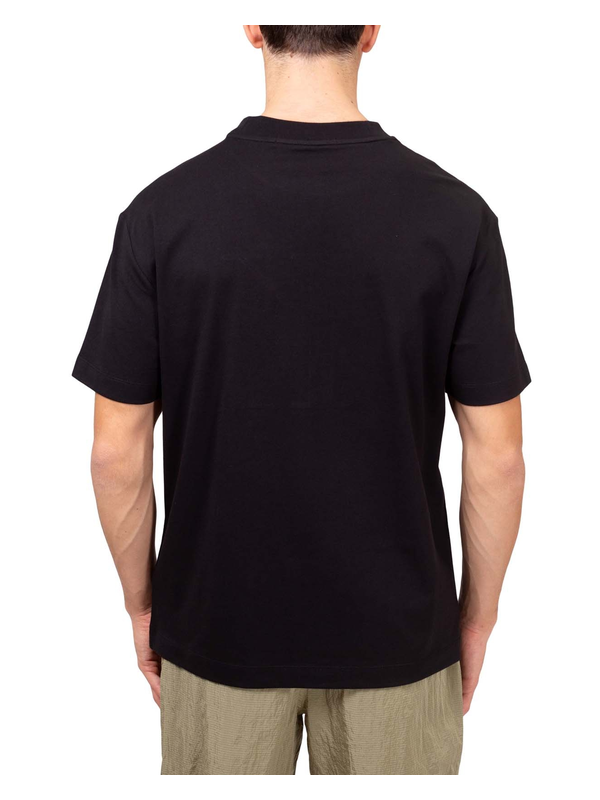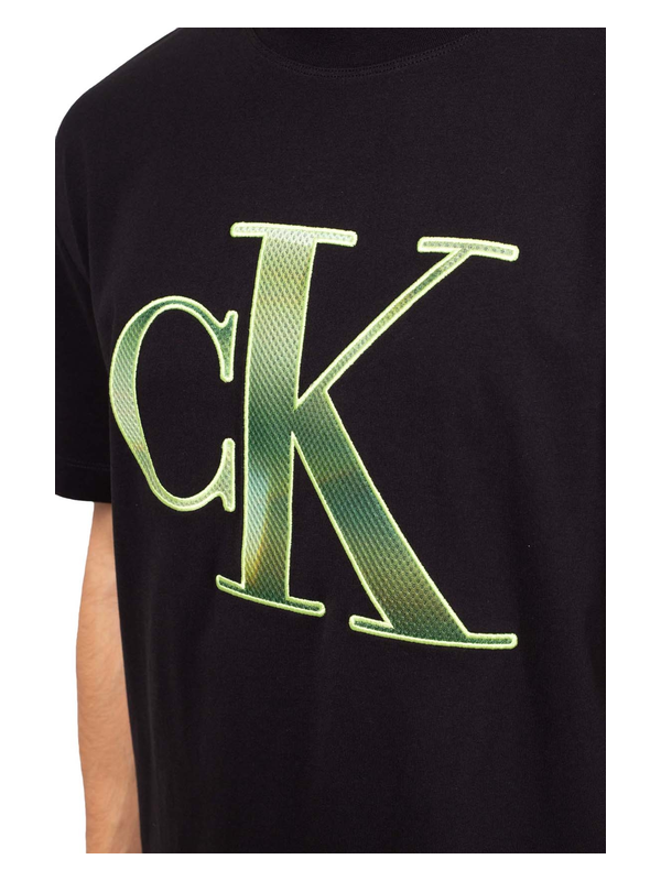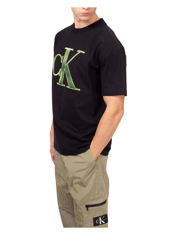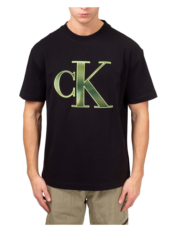 Opuštena Calvin Klein muška majica kratkih rukava od čistog crnog pamučnog žerseja, s rebrastim dekolteom i kontrastnim Calvin Klein Jeans monogramom od najlonske mreže na prednjoj strani.