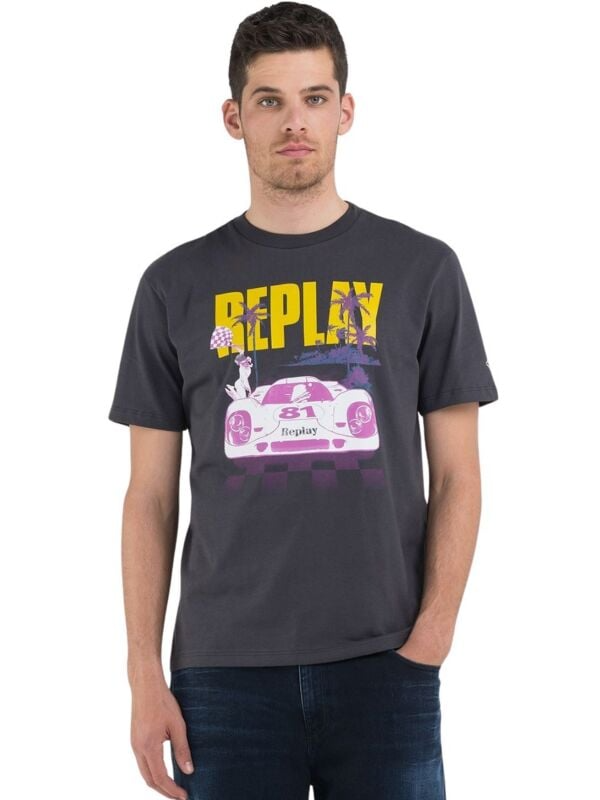Replay isprana muška majica sa žutim logo printom, ljubičastim palmama i printom trkaćeg automobila.
