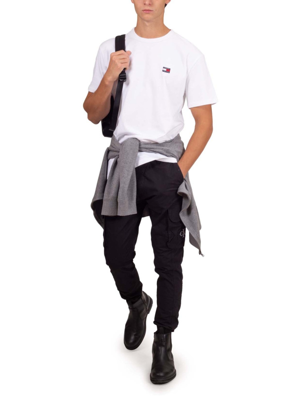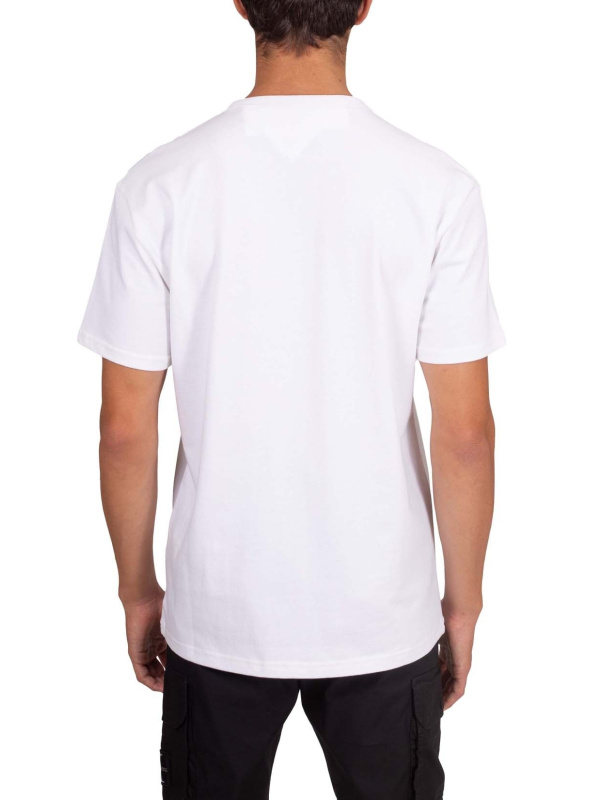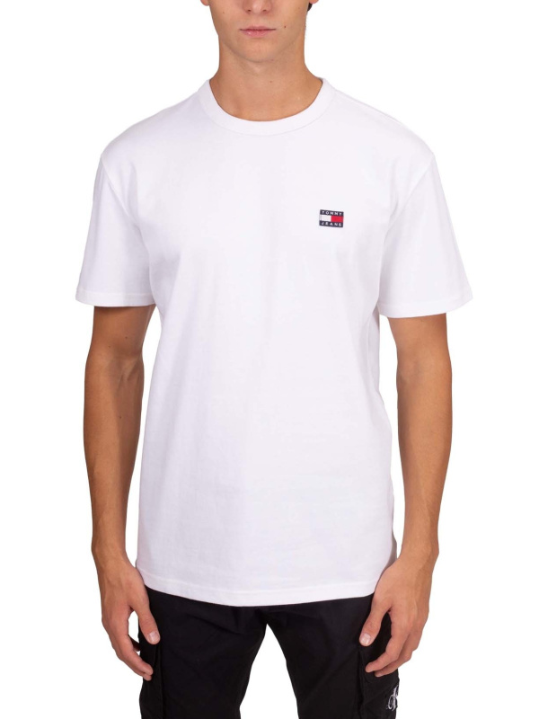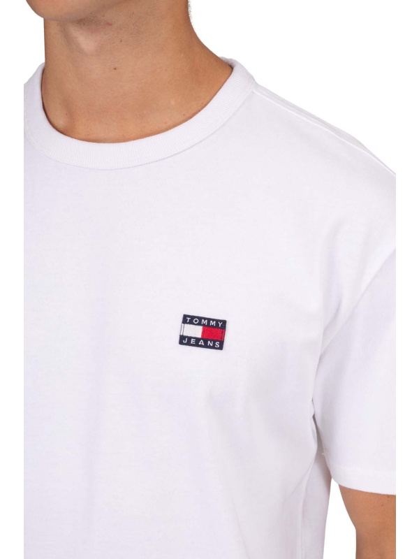 Opuštena muška majica kratkih rukava od čistog bijelog pamučnog žerseja, s rebrastim izrezom i logom Tommy Jeans na prednjoj strani.