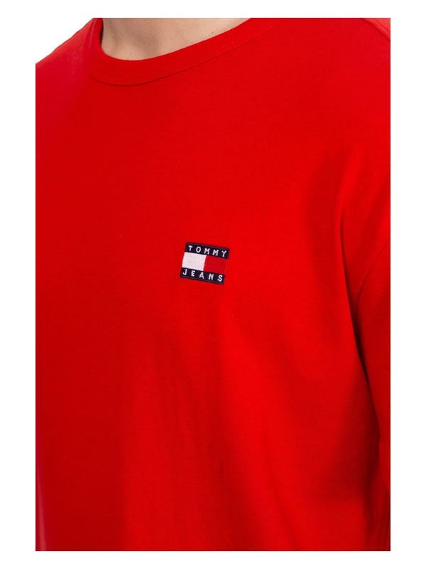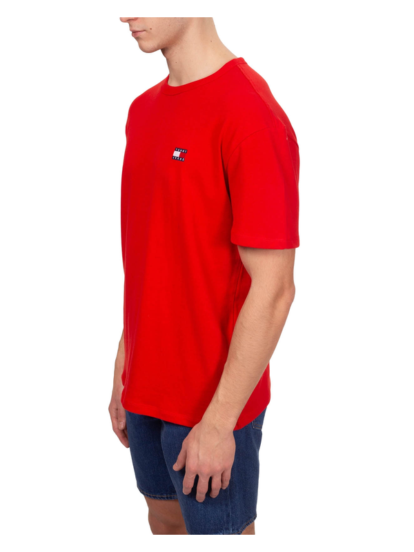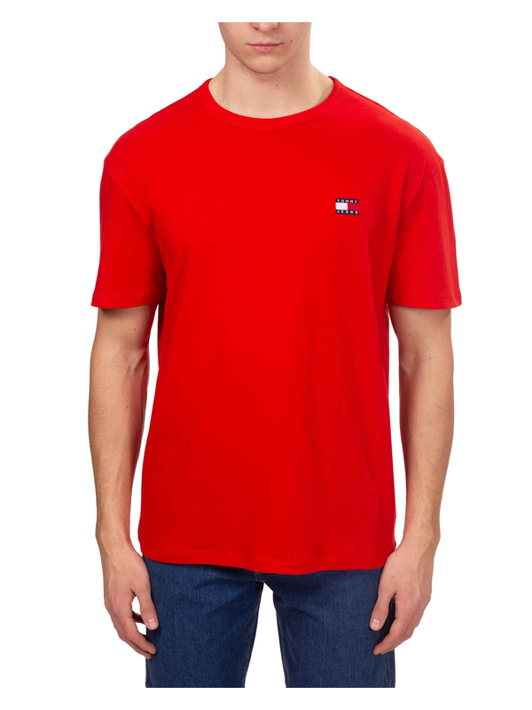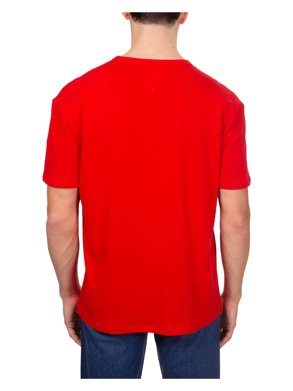 Muška majica Tommy Hilfiger kratkih rukava, od čistog crvenog pamučnog žerseja, s rebrastim dekolteom i Tommy Jeans logom izvezenim sprijeda.