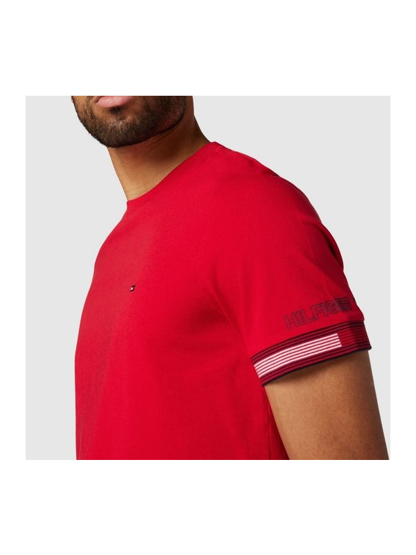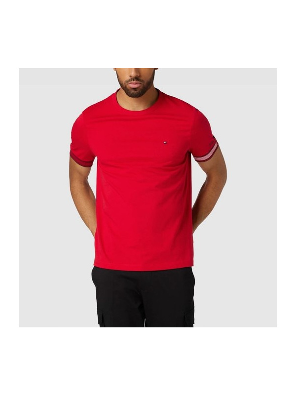 Postignite Tommy stil bez napora s ovom pamučnom majicom kratkih rukava, završenom prugastim manšetama u prepoznatljivim bojama i ispisom logotipa na rukavu.