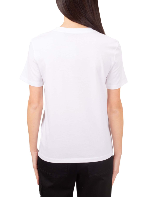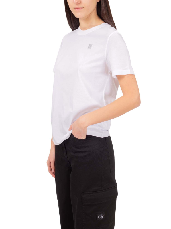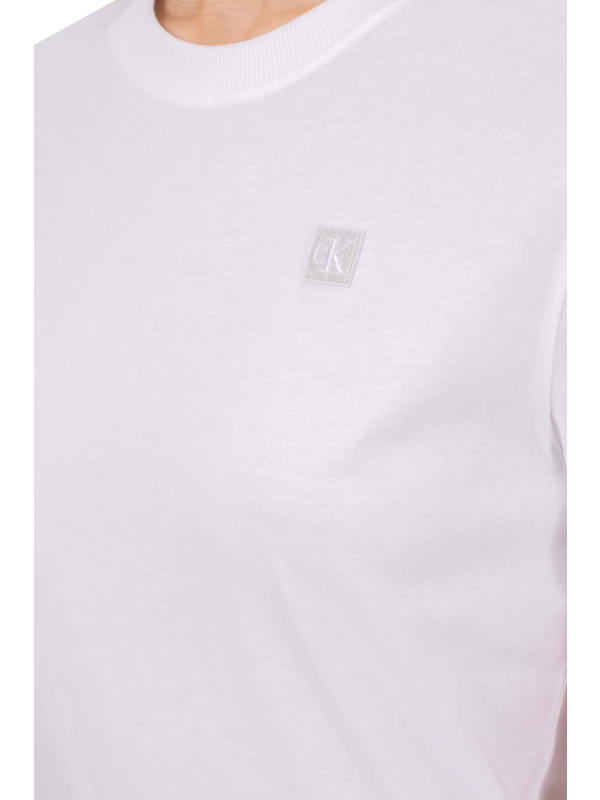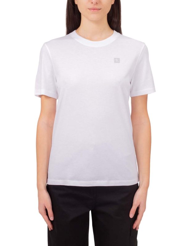 Ženska Calvin Klein majica kratkih rukava, od čistog bijelog pamučnog žerseja, s rebrastim dekolteom i krpom s monogramom Calvin Klein Jeans na prednjoj strani.