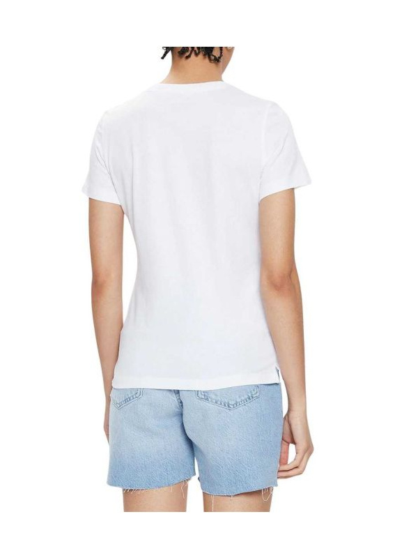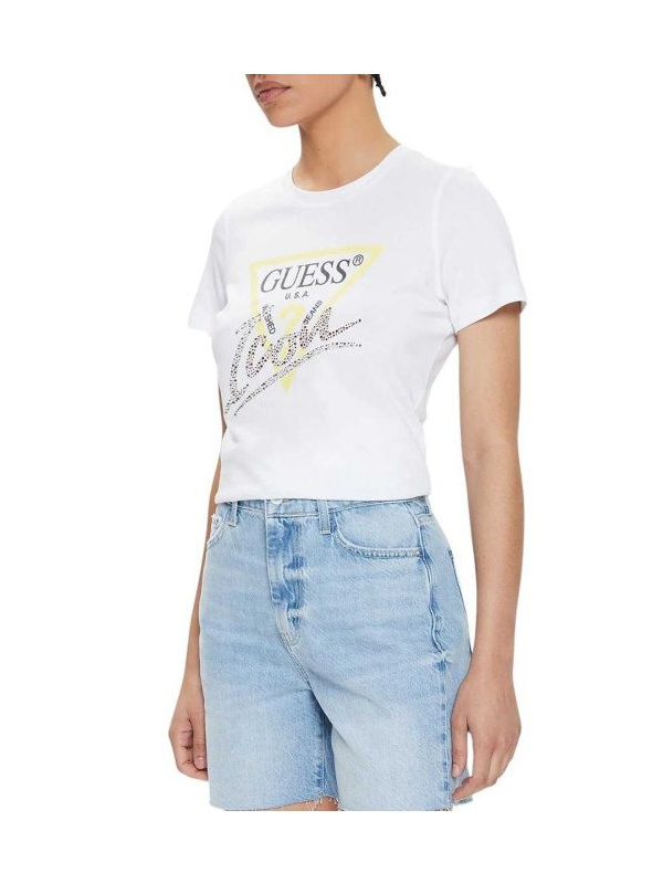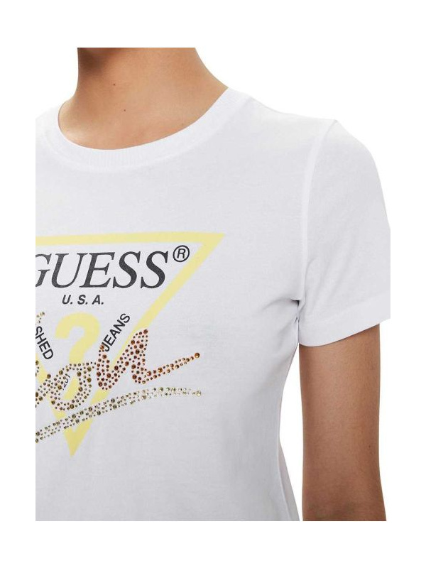 Ženska pamučna Guess Icon bijela logo majica sa žutim trouglom