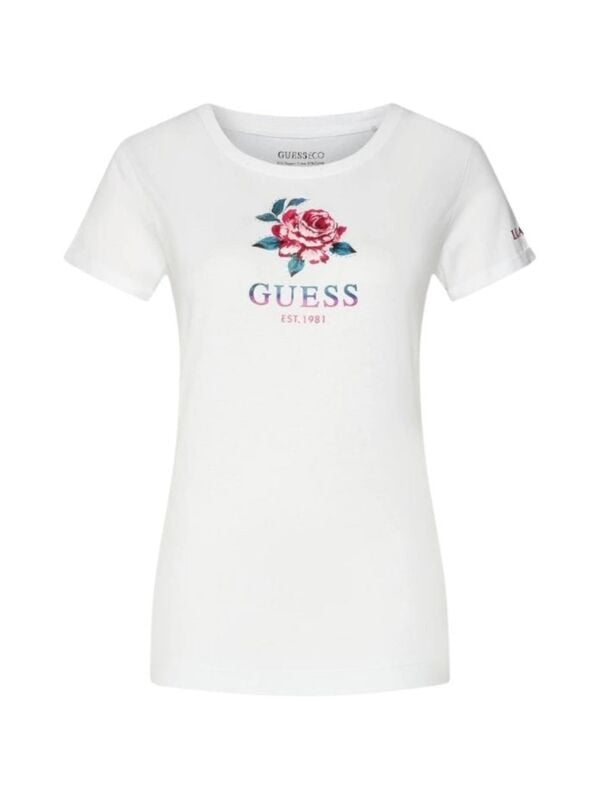 Guess Glittery bijela ženska majica sa printom ruže i logoa