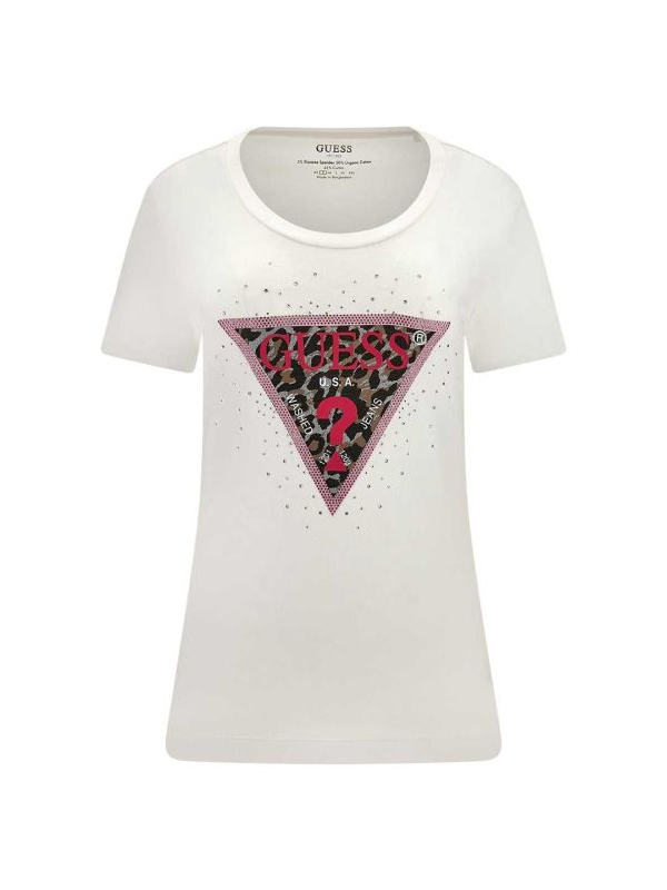 Bijela majica sa leopard print trouglom i ciklama Guess printom
