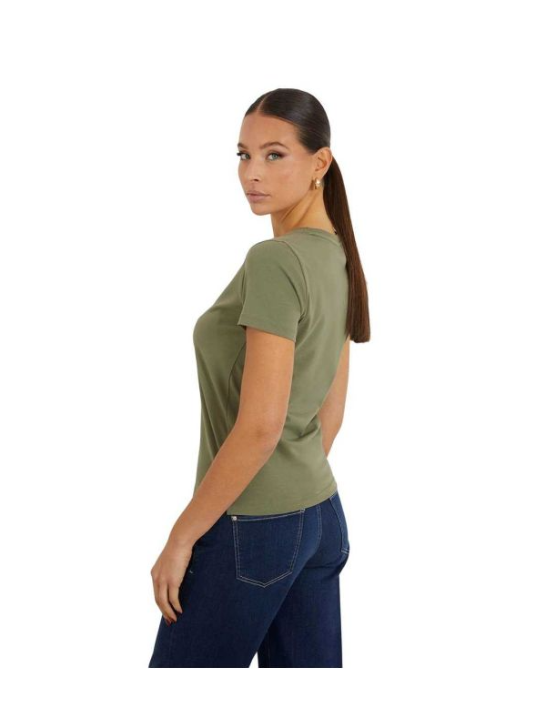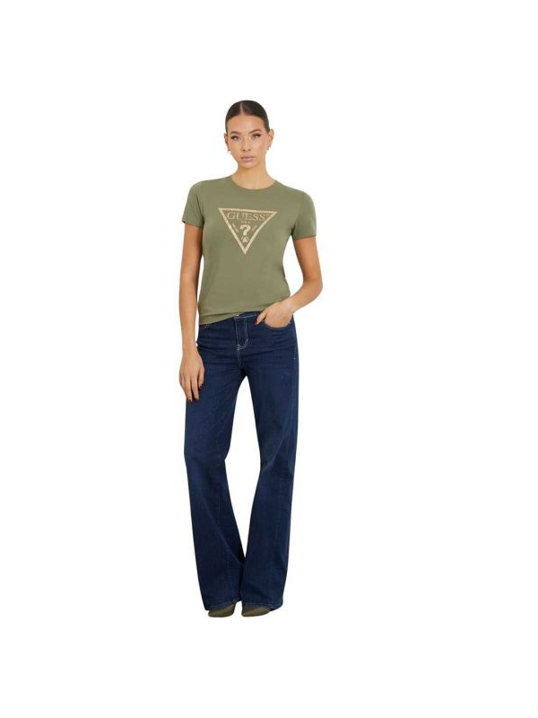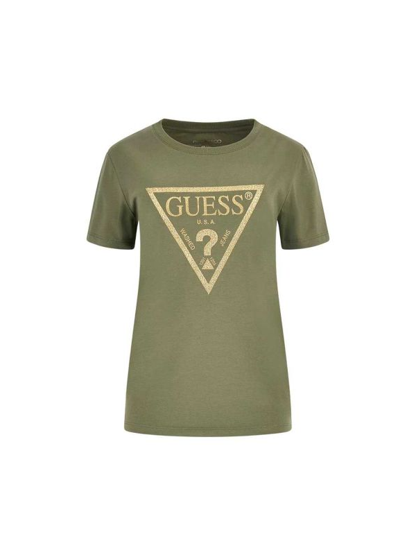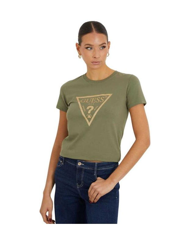 Guess maslinasta ženska majica sa zlatnim trouglastim logom i sitnim nitnama