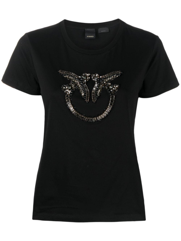 Crna PINKO majica kratkih rukava Love Birds ukrašena perlicama