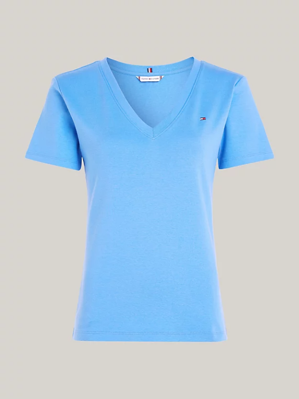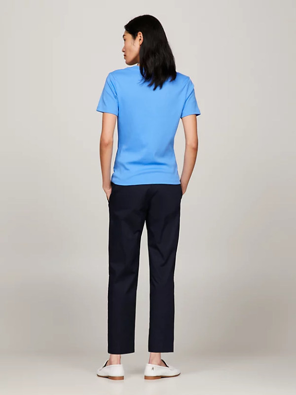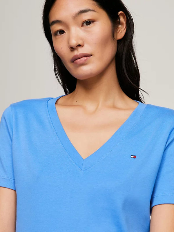 Ženska Tommy Hilfiger majica kratkih rukava, od čistog bijelog pamučnog žerseja, s rebrastim dekolteom i vezom zastavice Tommy Hilfiger na prednjoj strani.