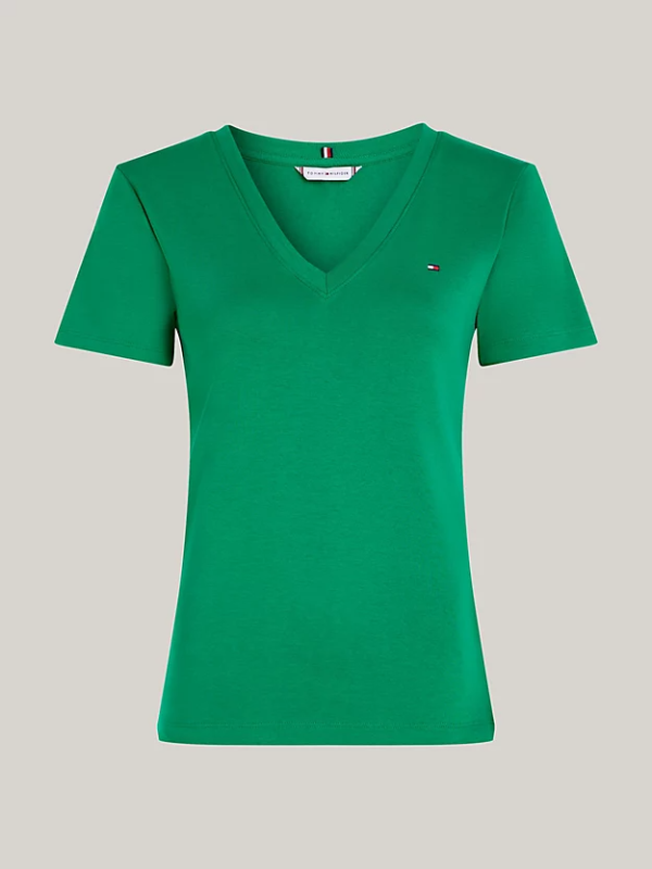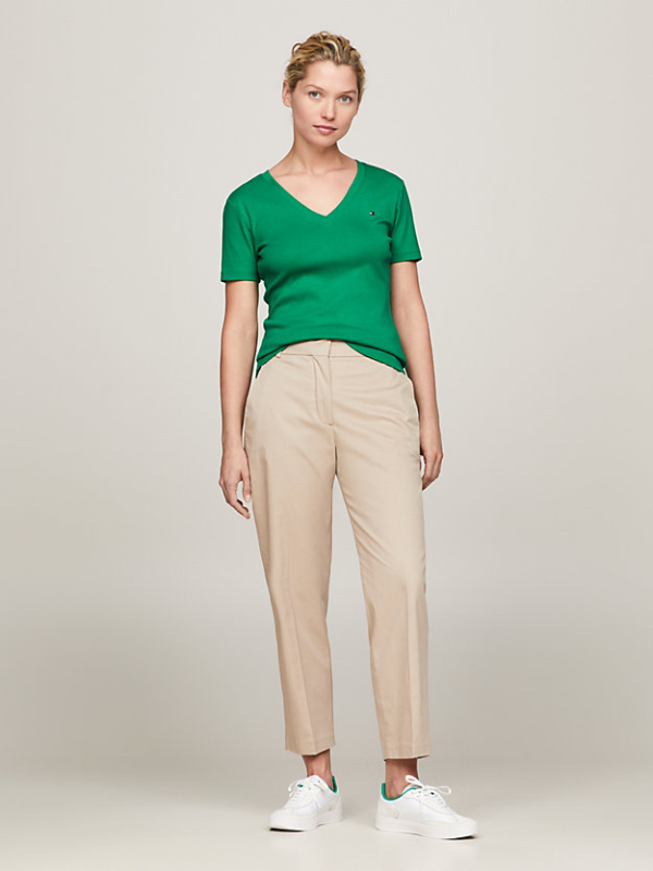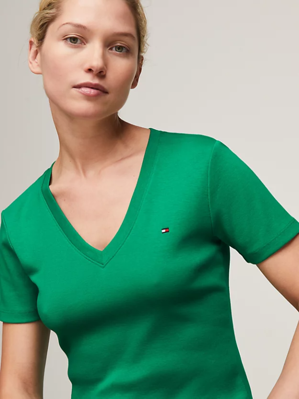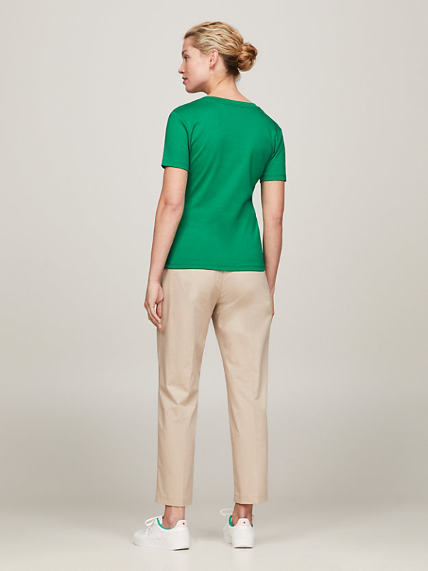 Ženska Tommy Hilfiger majica kratkih rukava, od čistog bijelog pamučnog žerseja, s rebrastim dekolteom i vezom zastavice Tommy Hilfiger na prednjoj strani.