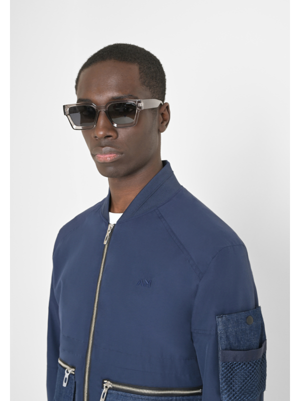 Gornja odjeća ističe se izvezenim logotipom na prsima, dok su prednji kopči i maksi džepovi pričvršćeni patentnim zatvaračima, s kontrastnom traper tkaninom i gornjim preklopima.