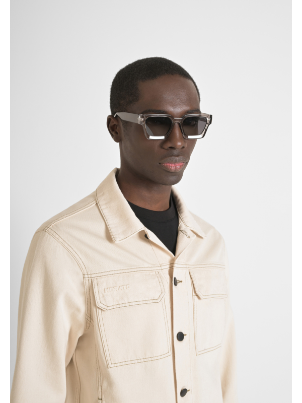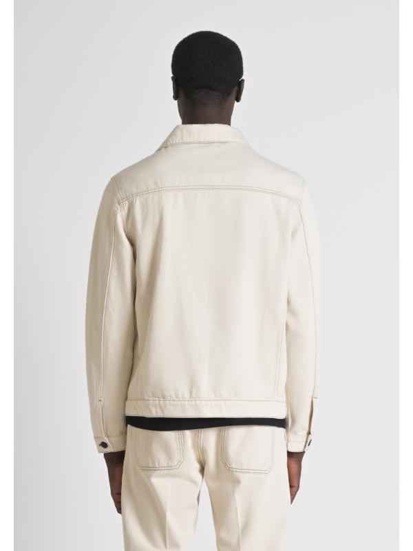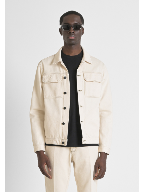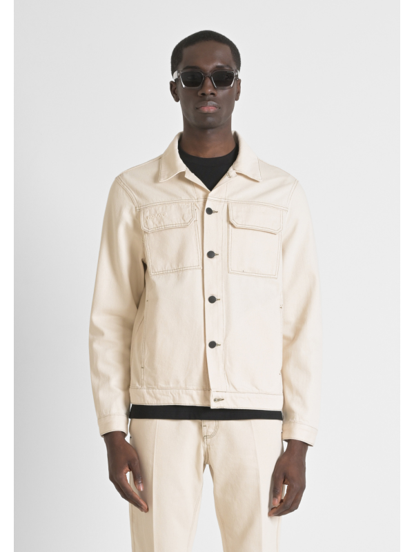 Kopčanje gumbima u kontrastu i reljefni logo na jednom od dva prednja džepa izdvajaju ga.