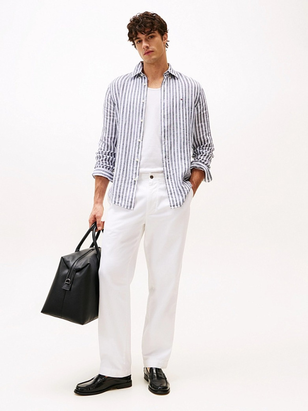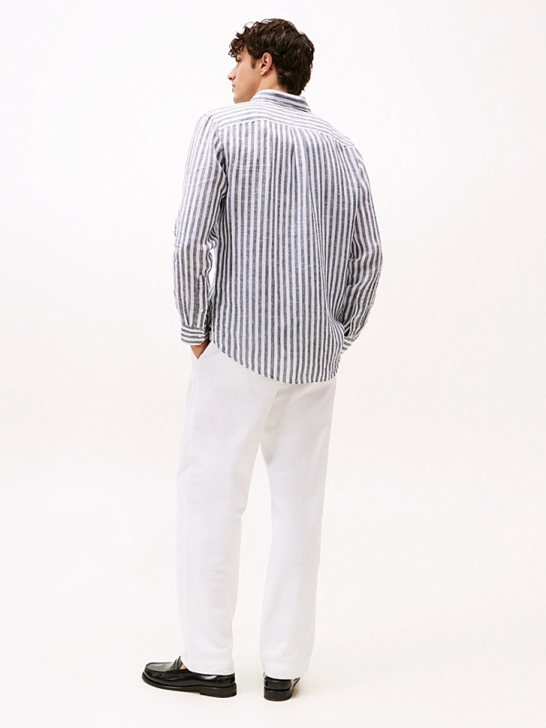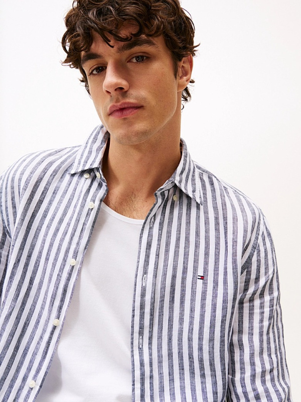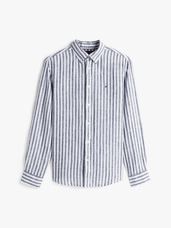 Muška lanena Tommy Hilfiger košulja dugih rukava na pruge u kombinaciji tamnoplave i bijele boje