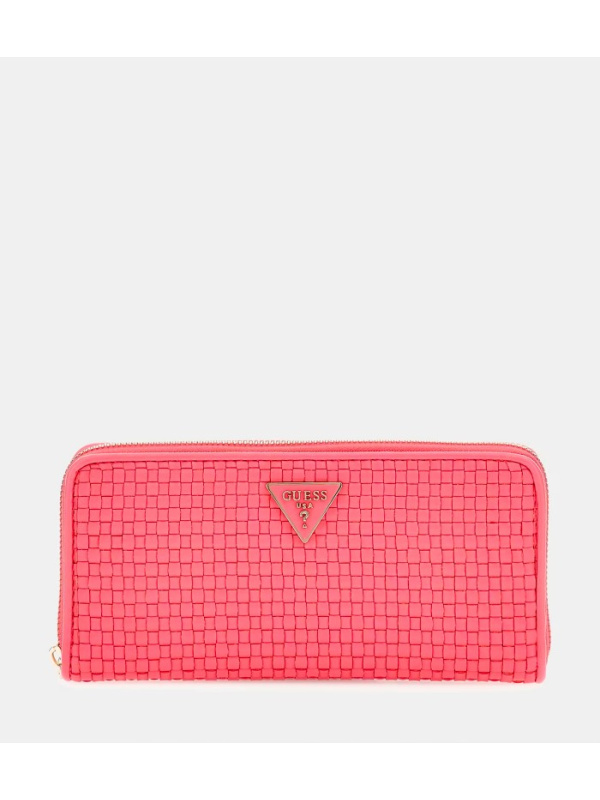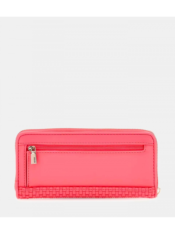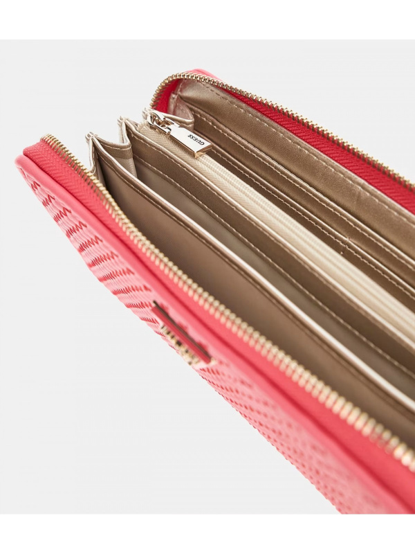 Elegantan i praktičan ženski rozi Guess novčanik s gornjim dijelom od pletene sintetičke kože.