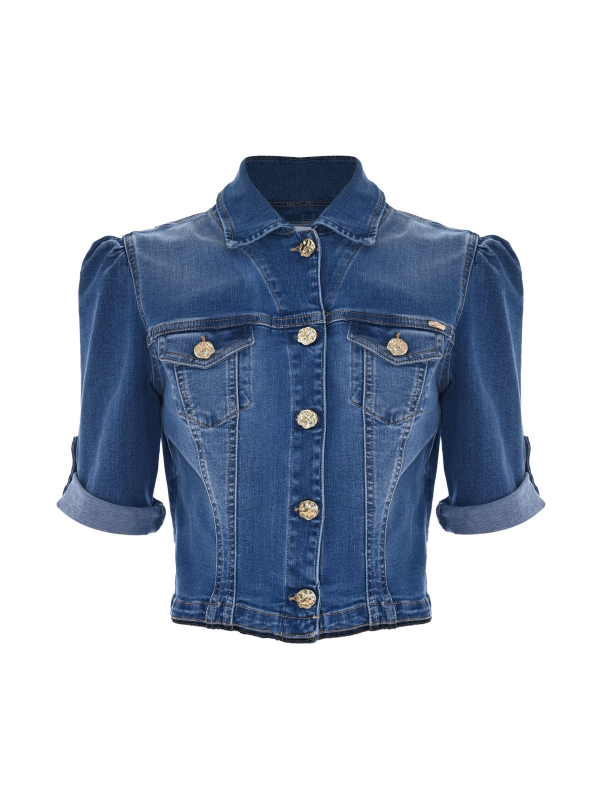 Model ima skraćeni kroj, puf rukave s preklopom i gumbom, džepove s preklopom, šiljasti ovratnik i draguljaste gumbe.
