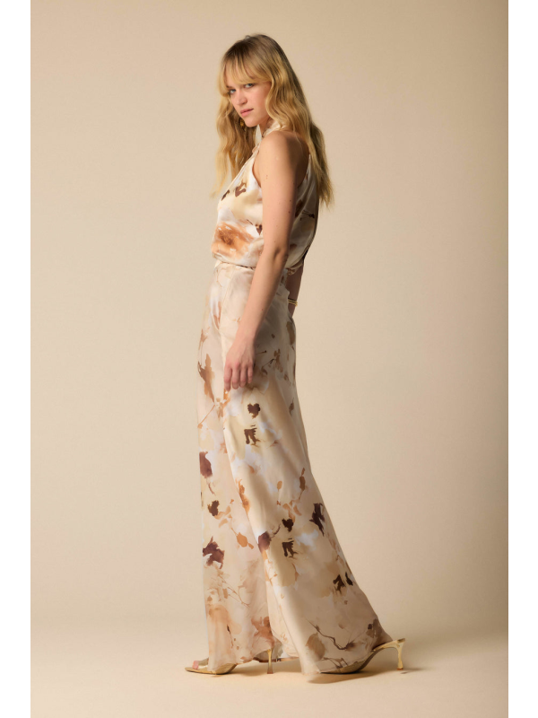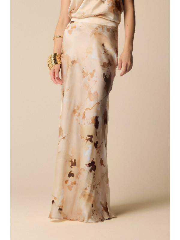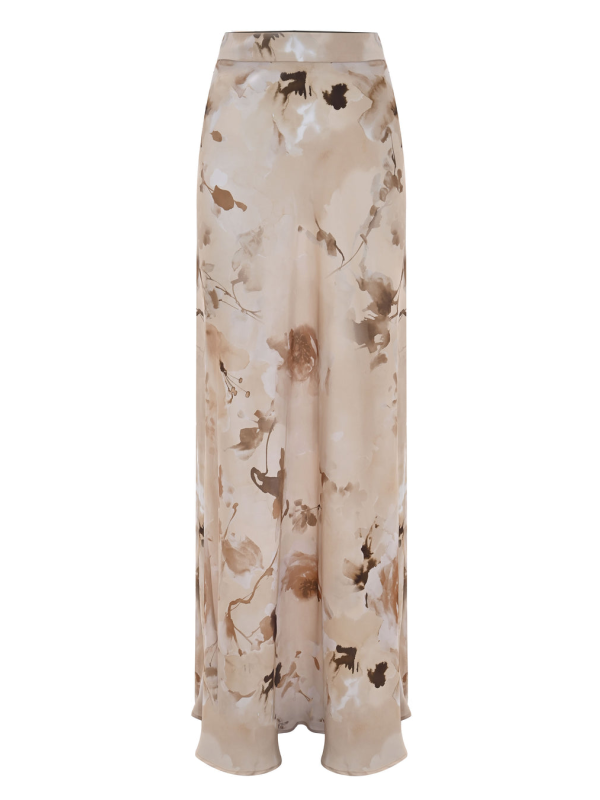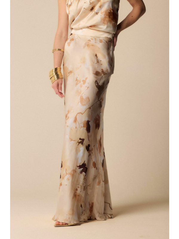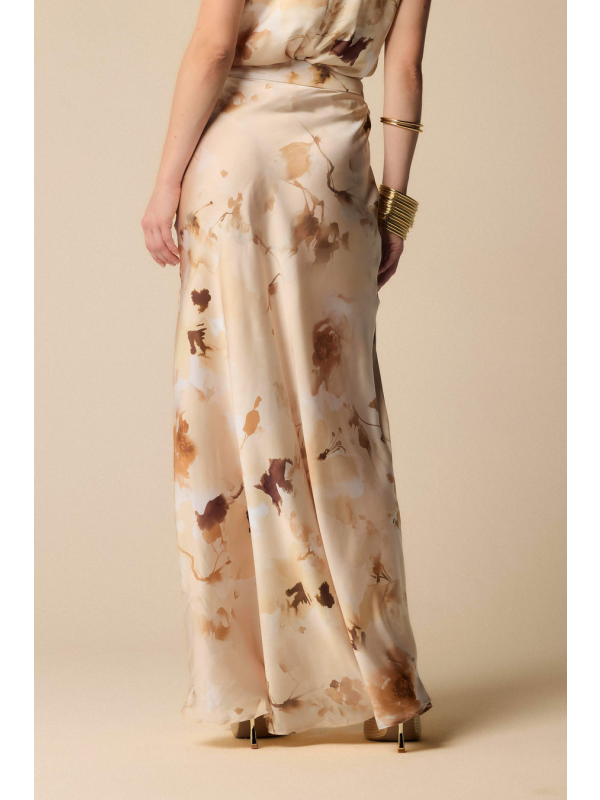Ova duga, elegantna i pripijena suknja ima all-over cvjetni print, pojas, prednji prorez i kopčanje patentnim zatvaračem sa strane.
