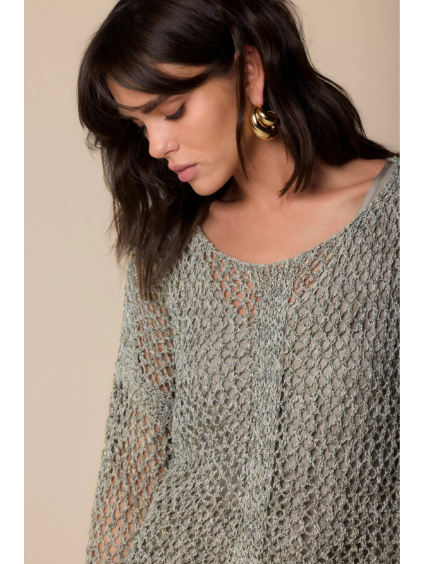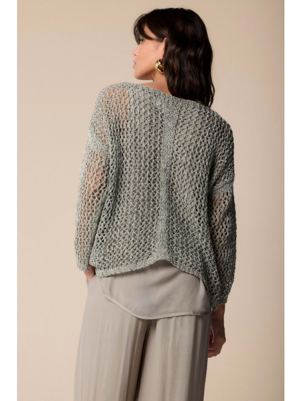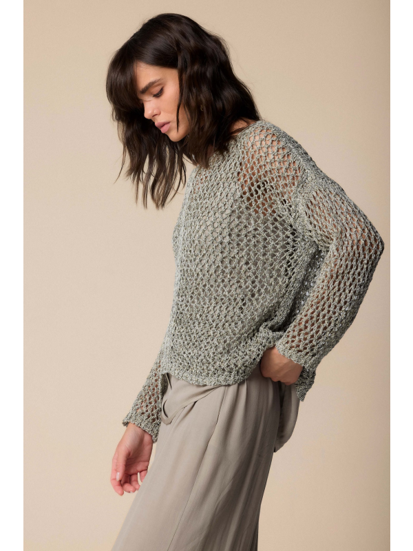 Mekani kroj za ovu košulju dugih rukava ukrašenu ažurnom izradom ukrašenom triko umetcima koju karakteriziraju spuštena ramena i rebrasti profili.