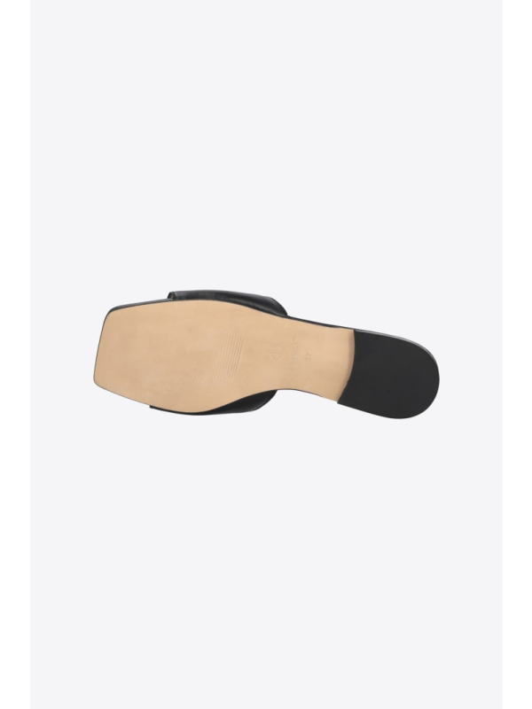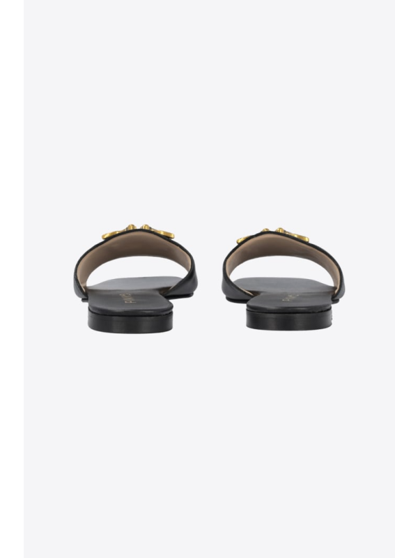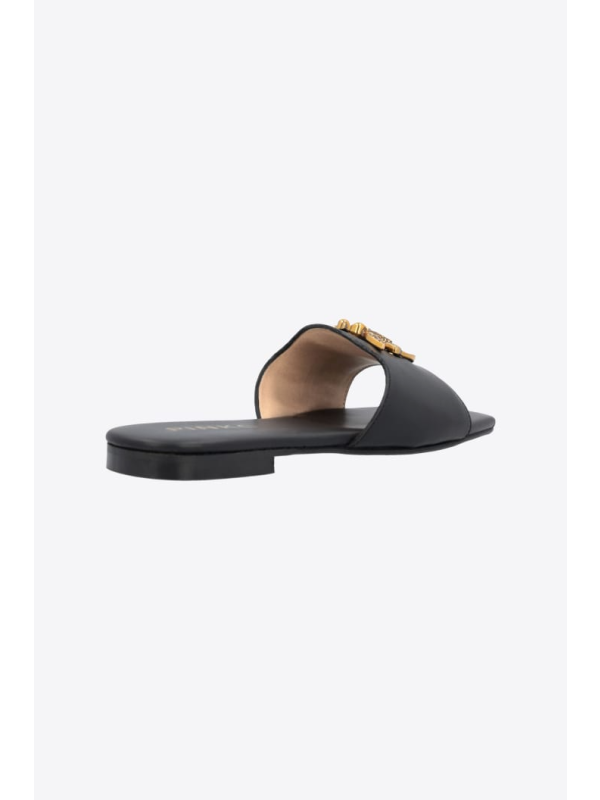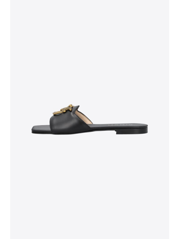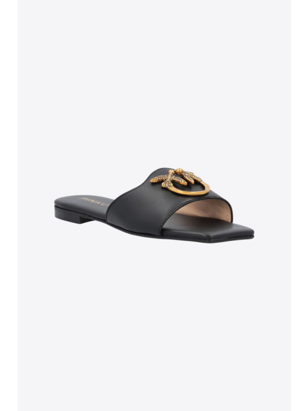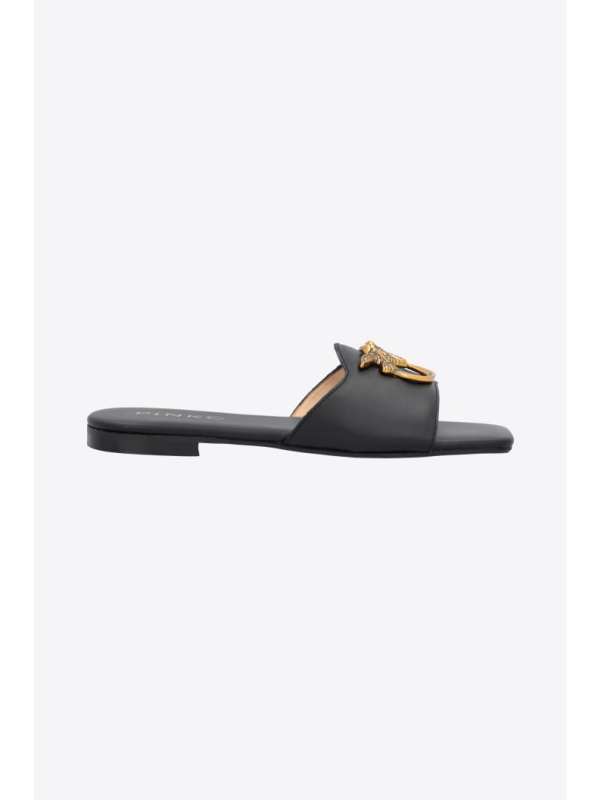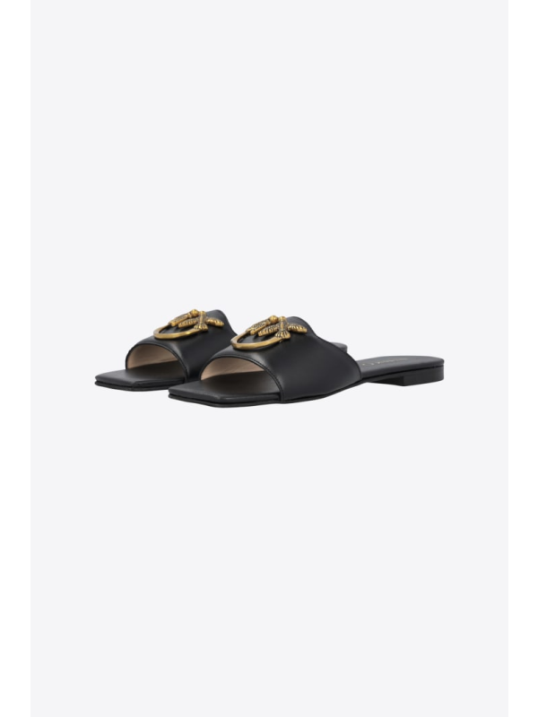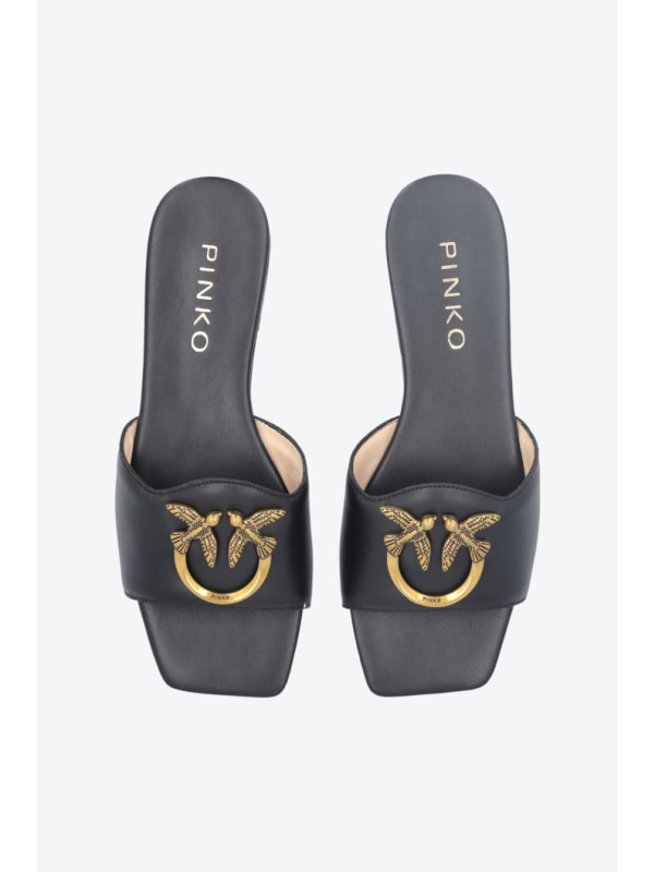 Ravne kožne natikače s prednjom trakom prilagođenom metalnim logom Love Birds.