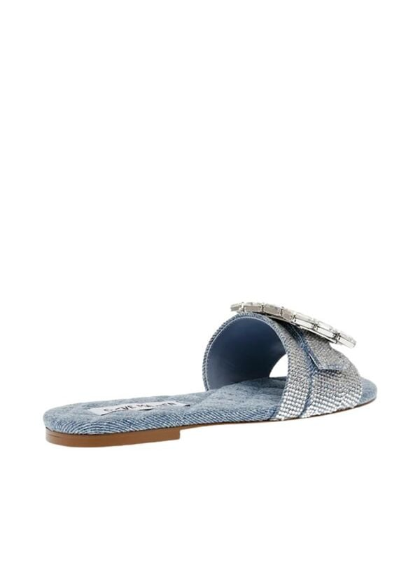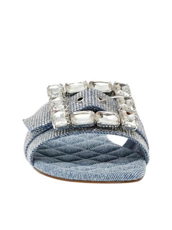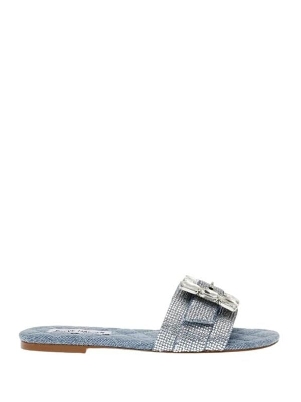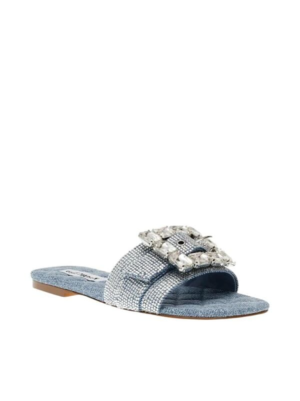 Steve Madden Getaway-R plave ženske teksas papuče prekrivene srebrnim cirkonima.