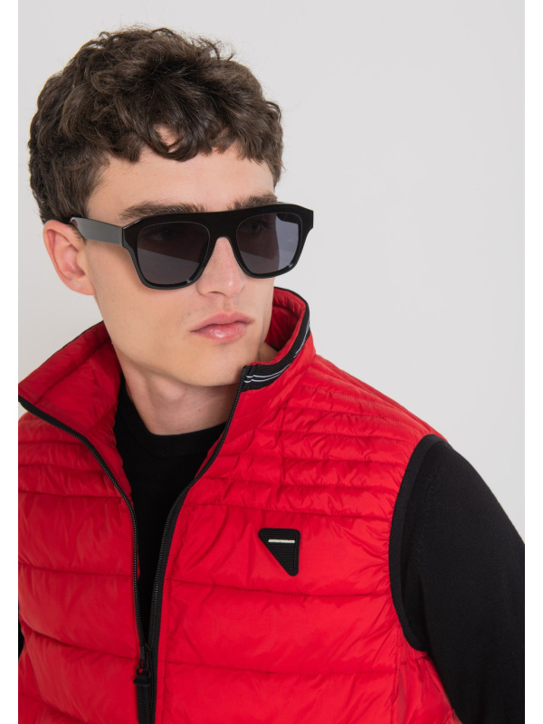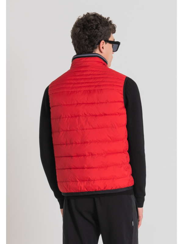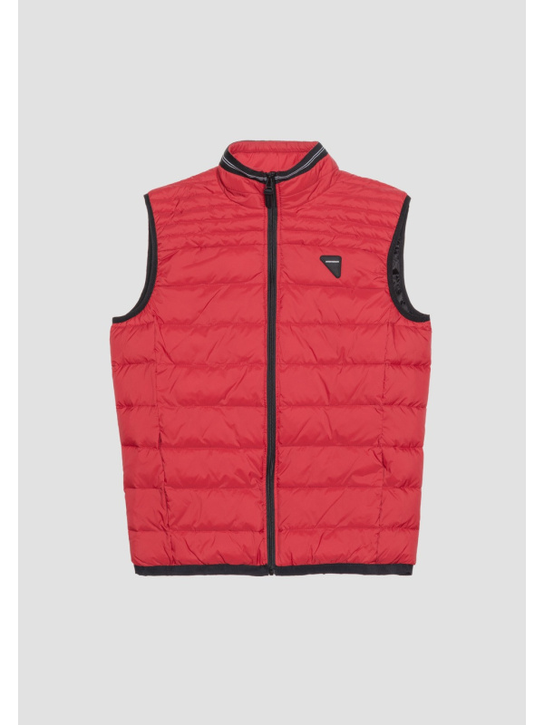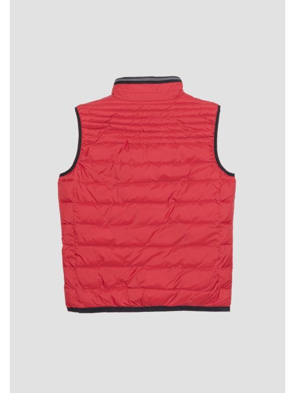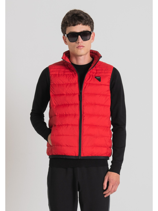 Crveni Antony Morato bomber prsluk izrađen od tehničke tkanine, s eko podstavom Sorona® DuPont. Dostupan u jednobojnoj boji, ima okrugli vrat, patentni zatvarač i pruge kontrastne boje na ovratniku, rukavima i rubu. Odjevni predmet zaokružuje gumena zakrpa s logotipom na lijevoj strani. Svestran i udoban, ovo je idealan odjevni predmet koji će upotpuniti svaki outfit tijekom prijelaznih mjeseci.