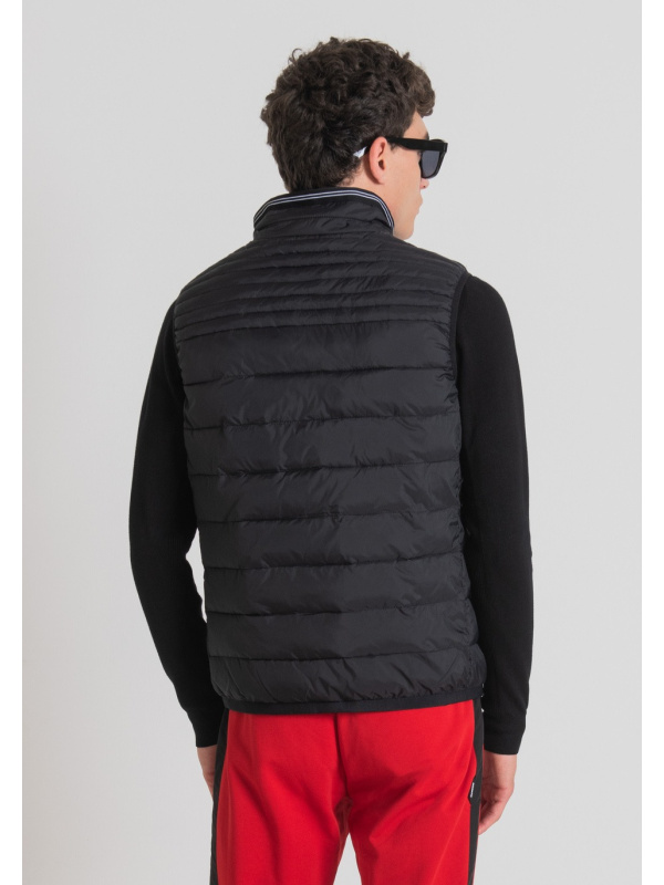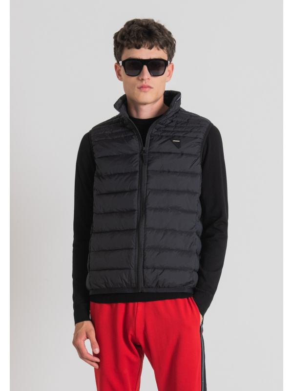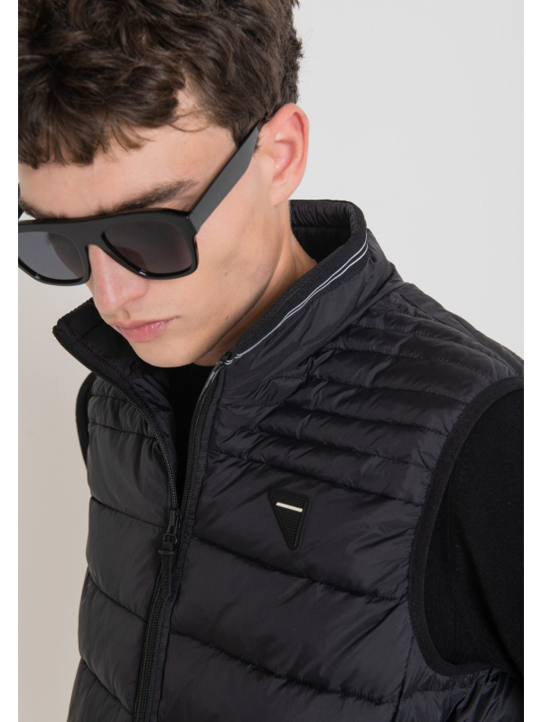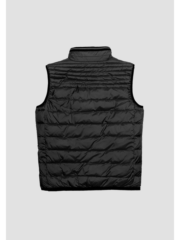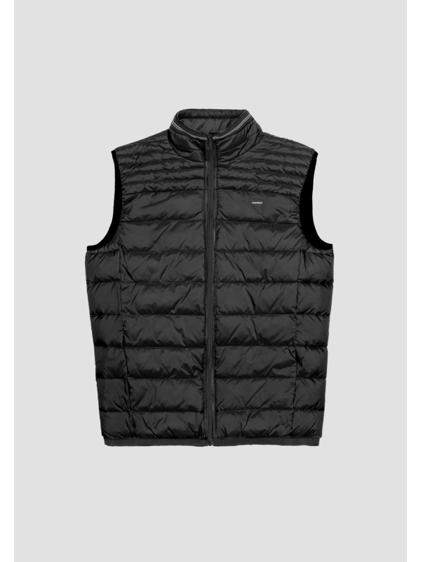 Bomber prsluk izrađen od tehničke tkanine, s eko podstavom Sorona® DuPont. Dostupan u jednobojnoj boji, ima okrugli vrat, patentni zatvarač i pruge kontrastne boje na ovratniku, rukavima i rubu. Odjevni predmet zaokružuje gumena zakrpa s logotipom na lijevoj strani. Svestran i udoban, ovo je idealan odjevni predmet koji će upotpuniti svaki outfit tijekom prijelaznih mjeseci.