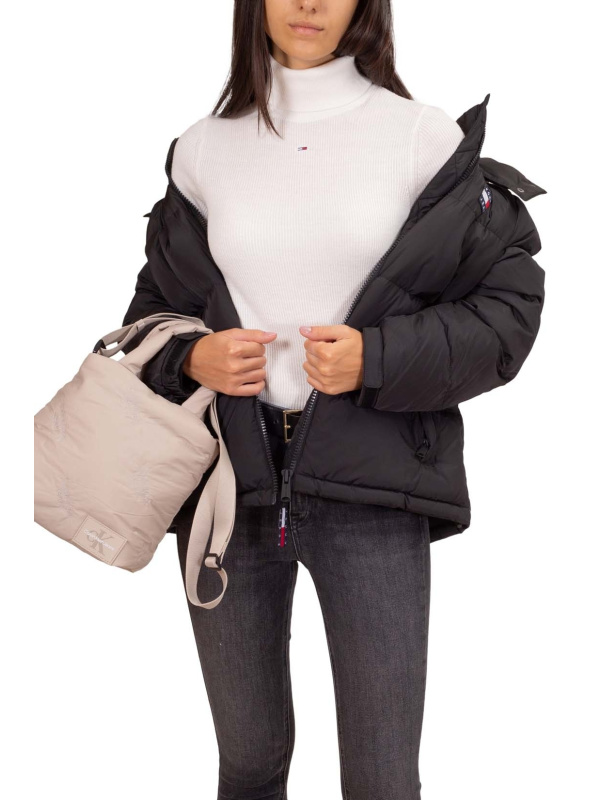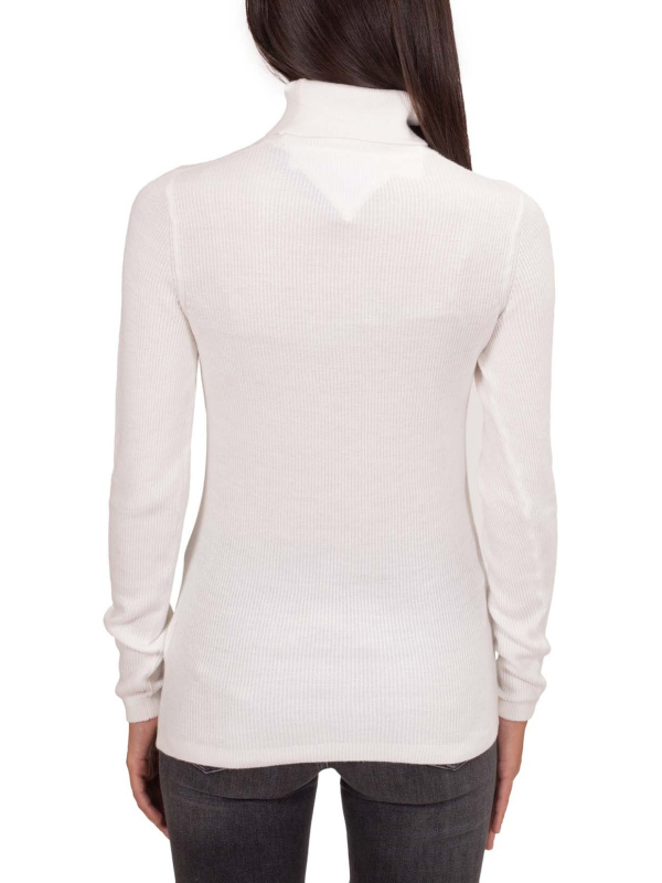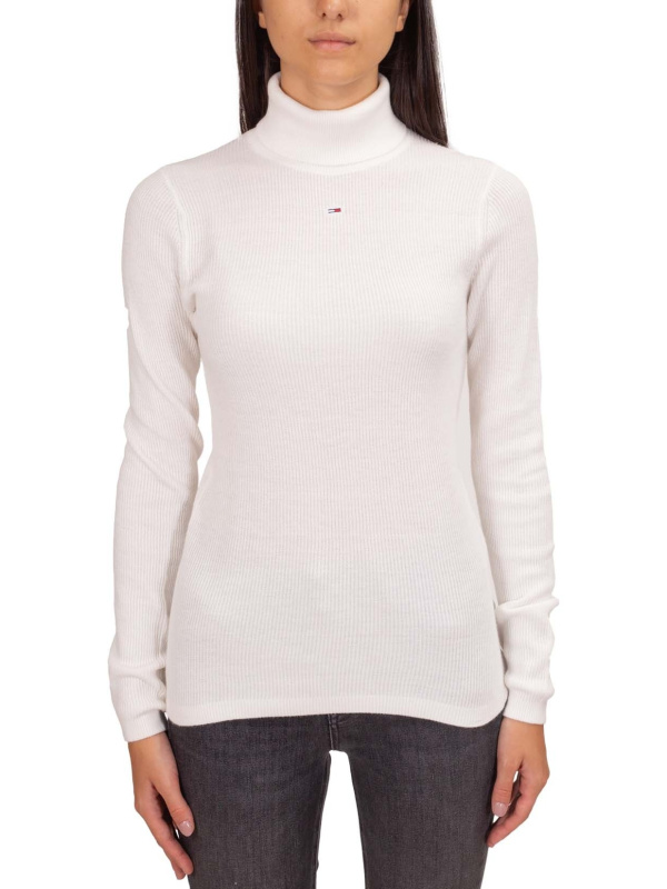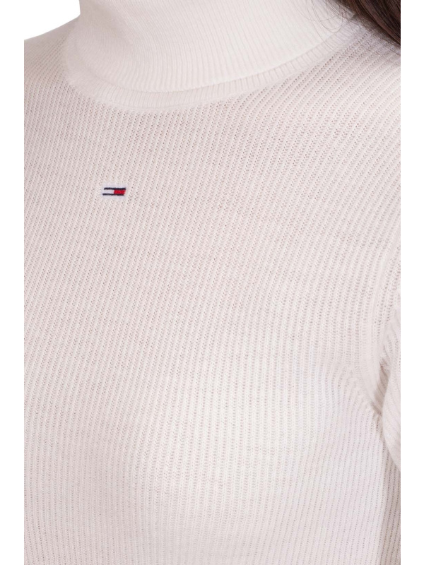 Tanak ženski pulover, od mješavine bijelog rebrastog pamuka, s visokim ovratnikom i vezom zastavice Tommy Jeans na prednjoj strani.
