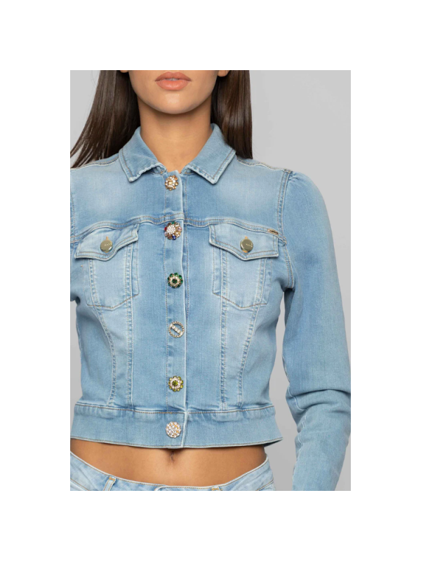 Ženska kratka KOCCA jakna od srednjeg pamučnog trapera, s prednjim džepovima i kopčanjem na različite sjajne gumbe. s ukrasnim gumbima na džepovima.