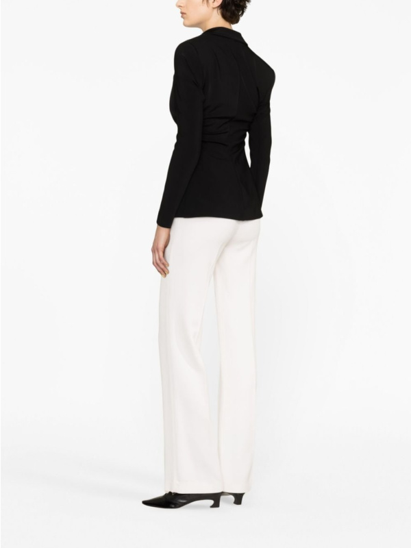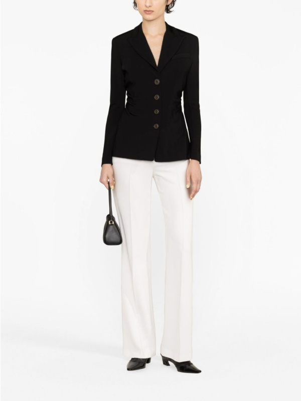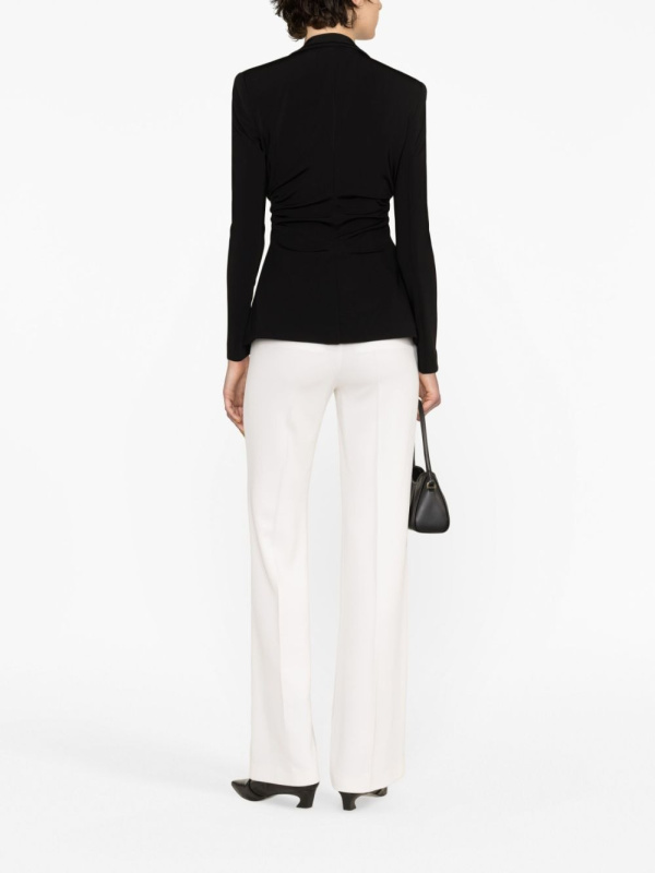 Skupljanje sa strane stvara meku teksturu kroz usku siluetu ovog sakoa s jednim kopčanjem, koji je završen zlatnim obrubljenim gumbima za promišljene detalje.