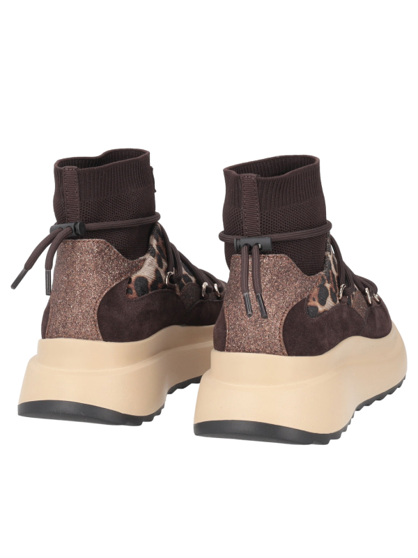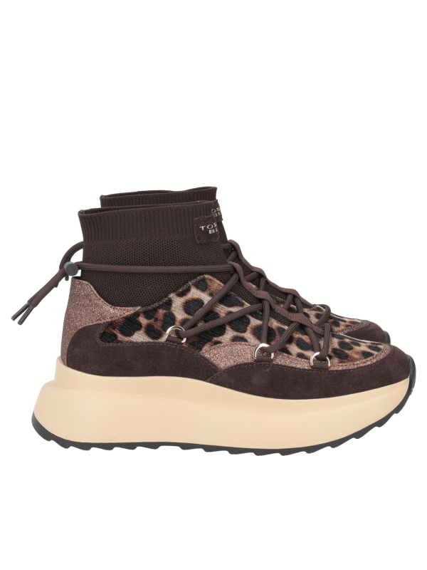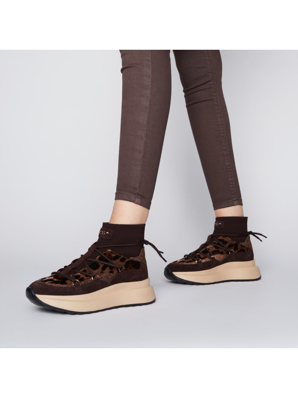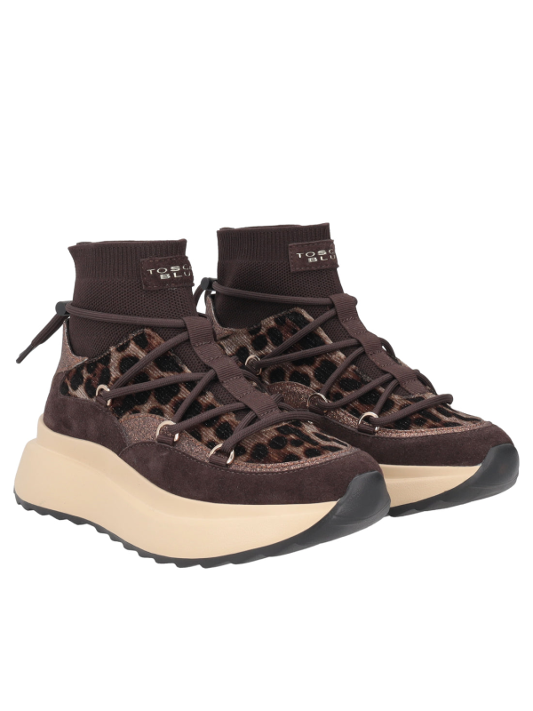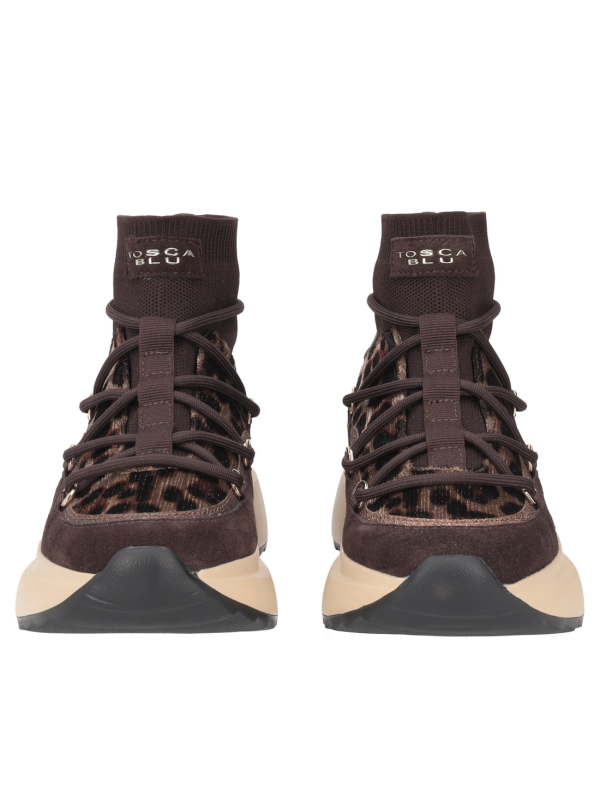 Ove tenisice marke Tosca Blu, namijenjene opuštanju, unijet će energiju u vašu garderobu živahnom vibrom. S odvažno lijepim motivom koji će zasigurno privući pažnju, savršeno su rješenje za ženu koja se ne boji izraziti svoju osobnost. Životinjski uzorak u tamnosmeđoj nijansi ukrašen je svjetlucavim detaljima koji svjetlucaju na svjetlu i dodaju originalan dodir. Ovaj komad obuće krase cjevaste vezice koje su provučene kroz metalne rupice za vezice i platforma za udoban hod. Ove tenisice s životinjskim printom, namijenjene opuštanju, diskretno nose logotip Tosca Blu na jeziku, što svjedoči o pažljivoj izradi brenda i vrhunskoj kvaliteti proizvoda.