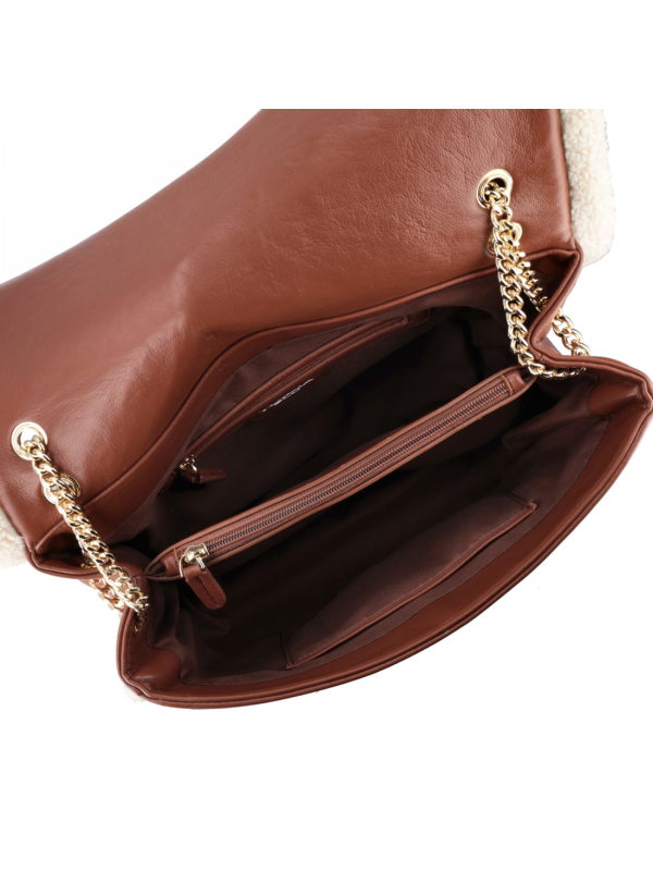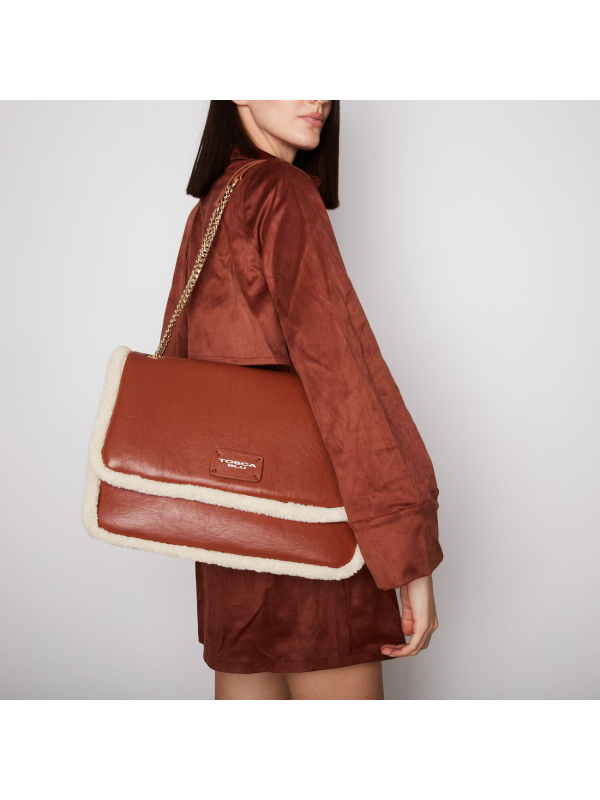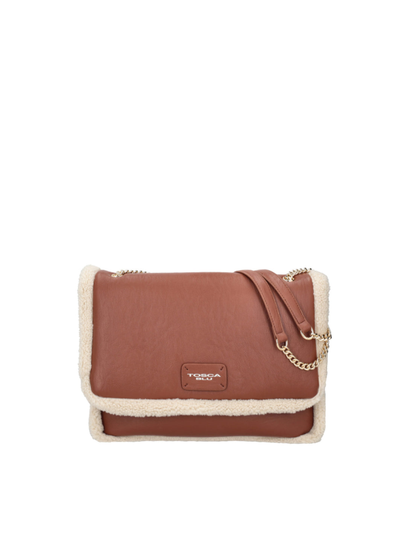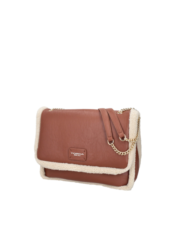 Velika torba preko tijela marke Tosca Blu uspješna je kombinacija praktičnosti i stila. Izrađena od recikliranog materijala u bež-smeđoj paleti, ima prepoznatljive detalje oko rubova od mekog teddy krzna. Ovaj modni dodatak se kopča metalnom kopčom na preklopu i uključuje tri praktična unutarnja pretinca i dva džepa (jedan otvoreni, a drugi s patentnim zatvaračem) kako biste sve svoje potrepštine držali urednima. Lančić i pločica s logotipom u kontrastnoj boji glamurozni su detalj koji će zasigurno privući pažnju. Ova velika torba preko tijela lako će se uklopiti u svaku odjevnu kombinaciju i unijeti dašak jednostavnog šika koji će privući sve poglede.