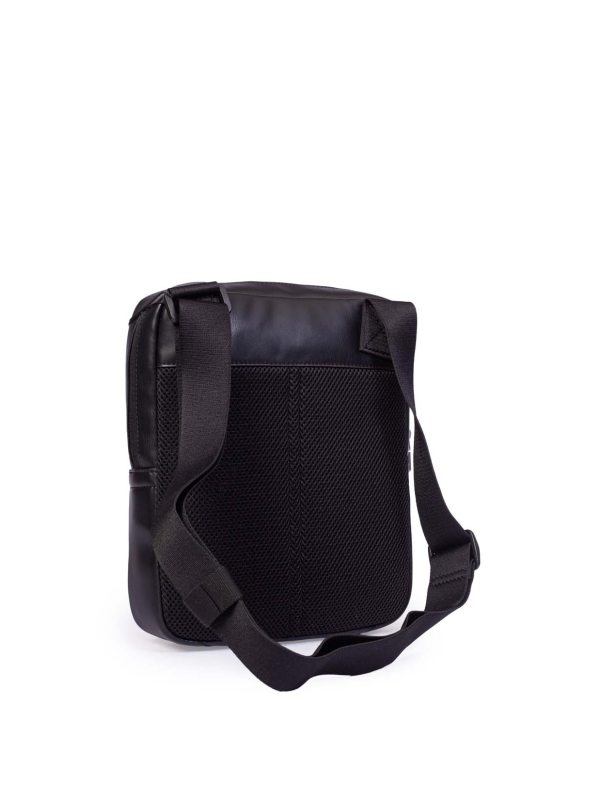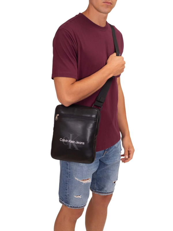 Muška torba za rame od crne umjetne kože s glatkom završnom obradom, s glavnim pretincem koji se zatvara, patentnim zatvaračem i logotipom Calvin Klein Jeans utisnutim na prednjoj strani.