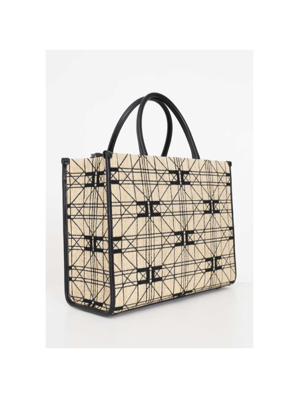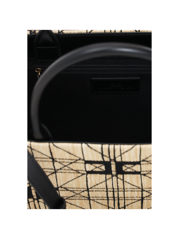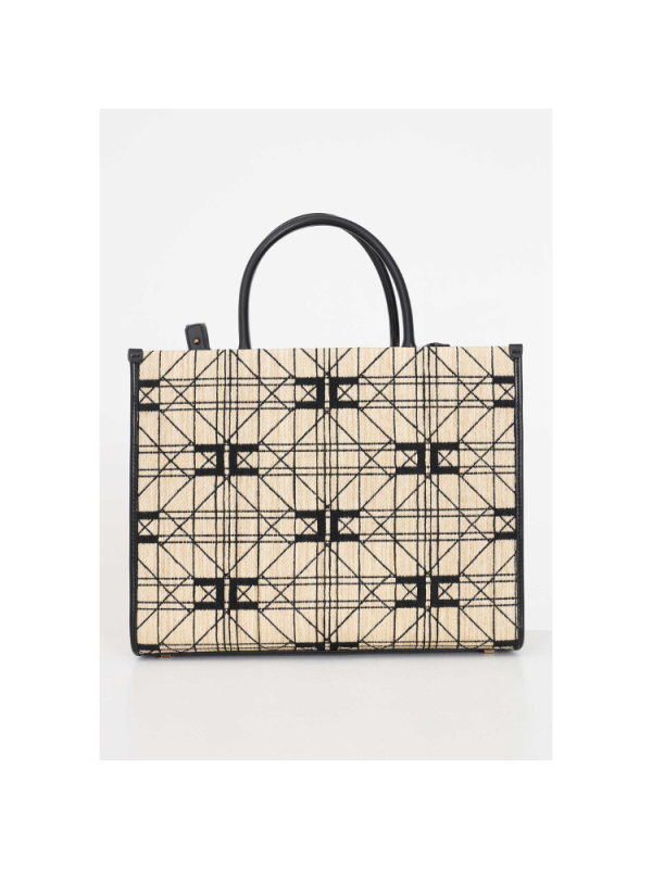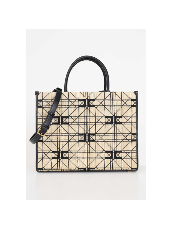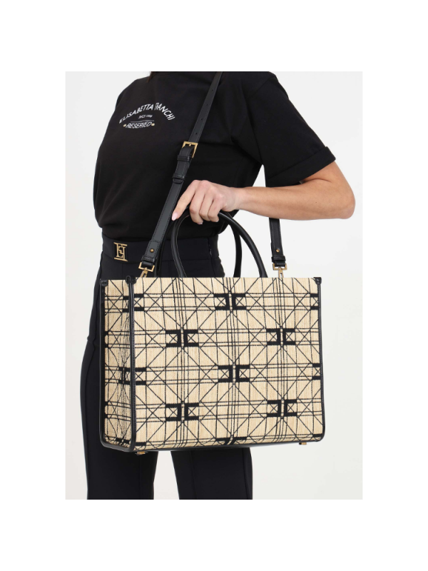 Ženska ELISABETTA FRANCHI torbica sa slamnatom naramenicom i crnim logom.