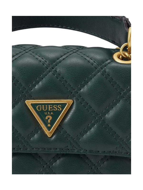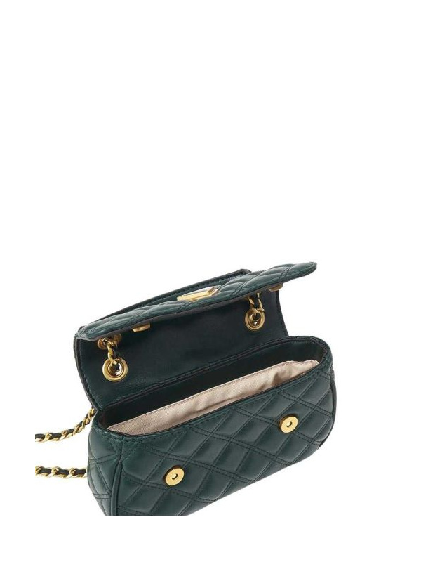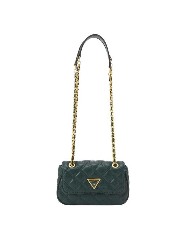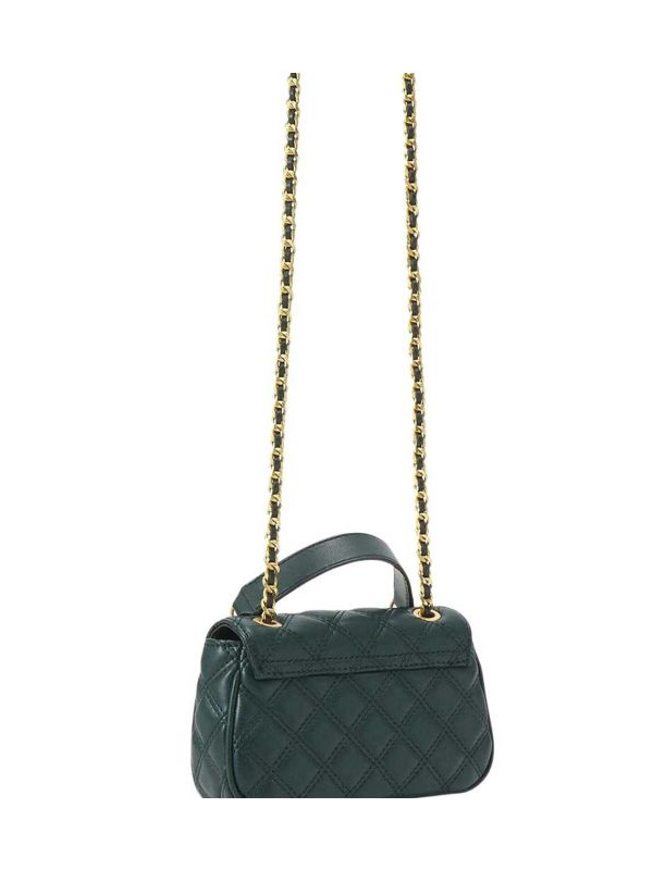 • Guess Giully Mini prošivena tamnozelena torbica sa zlatnim lancem na kaišu