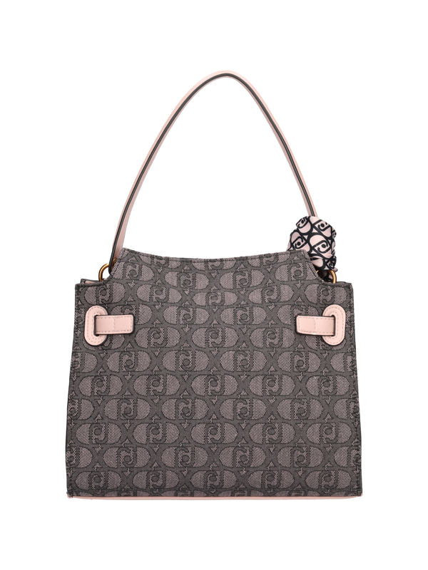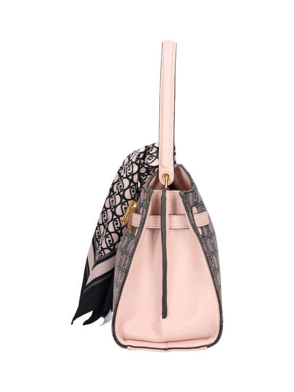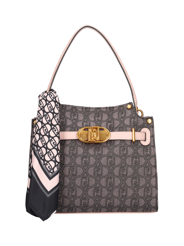 Ženska torbica Liu Jo od crne tkanine s logom sa zlatnim obrubom i detaljima od ružičaste eko kože, ručkom i podesivim remenom za rame također od bijele eko kože i ukrasnim šalom koji se može skinuti.