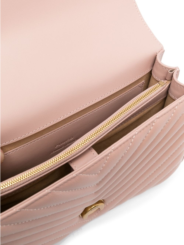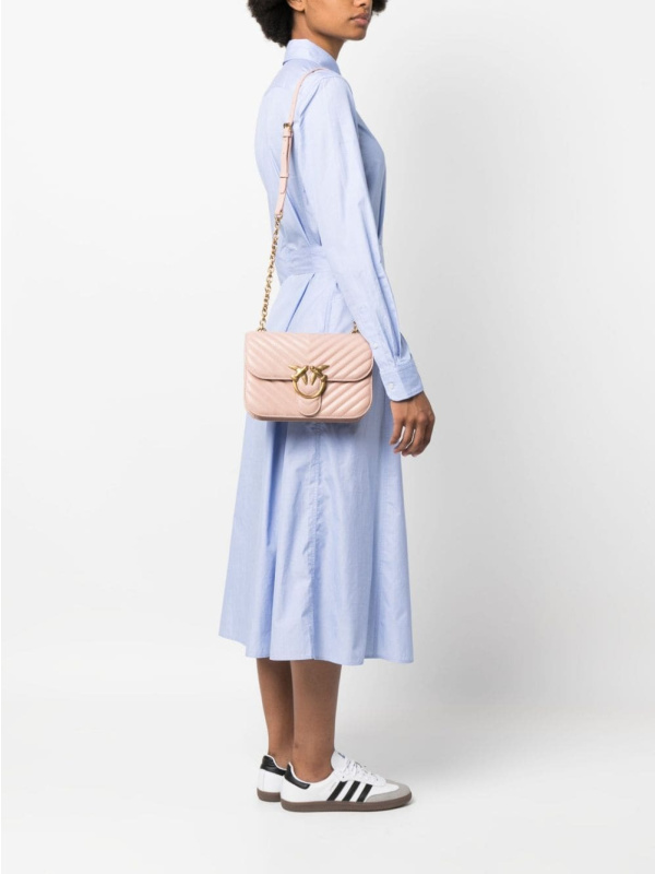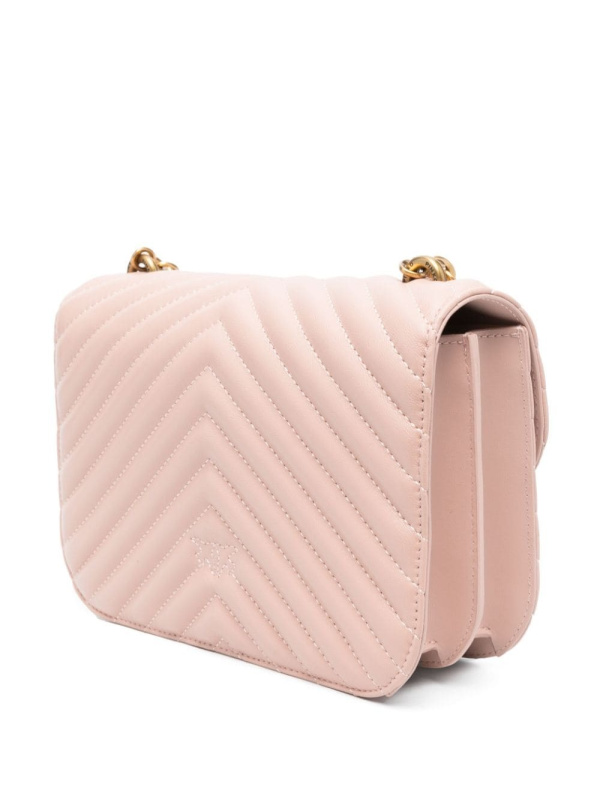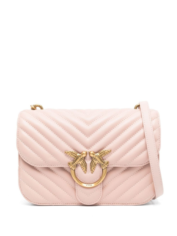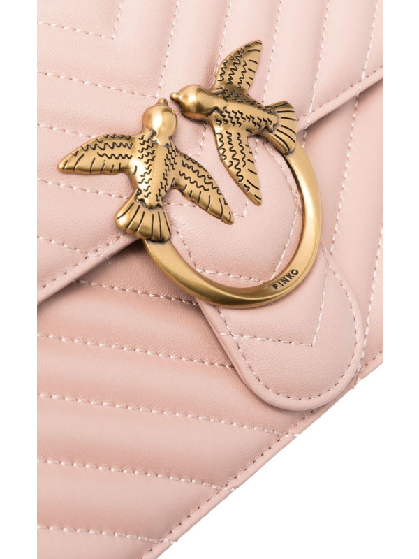 PINKO estetiku predstavlja prepoznatljiv logo Love Birds: trajni simbol 'ljubavi i slobode, snage i svjetla'. Nalazi se na vrhu kožne konstrukcije prošivene ševronima ove Classic Love one torbe preko ramena.
