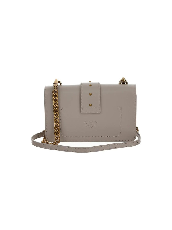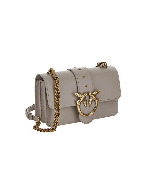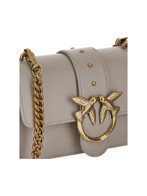 PINKO mini torba preko ramena od svilenkaste kože boje lješnjaka s kopčom s logotipom Love Birds sa starinskom zlatnom završnom obradom i ukrasima s nitnama na magnetskom zatvaraču, podesivom/odvojivom naramenicom s lančićem s kožnim detaljima, dva glavna pretinca podijeljena džepom s patentnim zatvaračem i ravnim džepom.